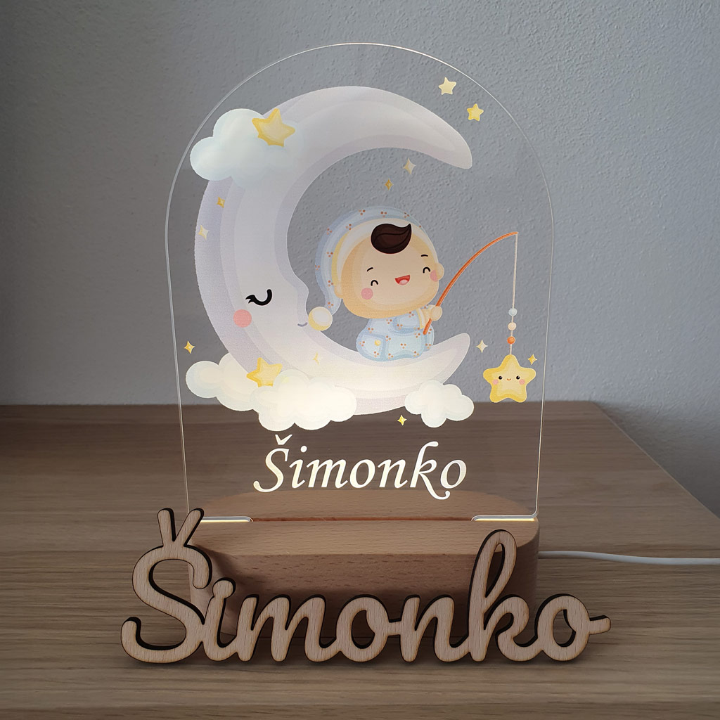 LED nočná lampa s vlastným menom dieťatka a motívom chlapčeka na mesiačiku rozžiari nielen detskú izbičku, ale aj očká detí. Je to tiež ideálny darček k narodeniu dieťatka, na krstiny, narodeniny, či meniny.