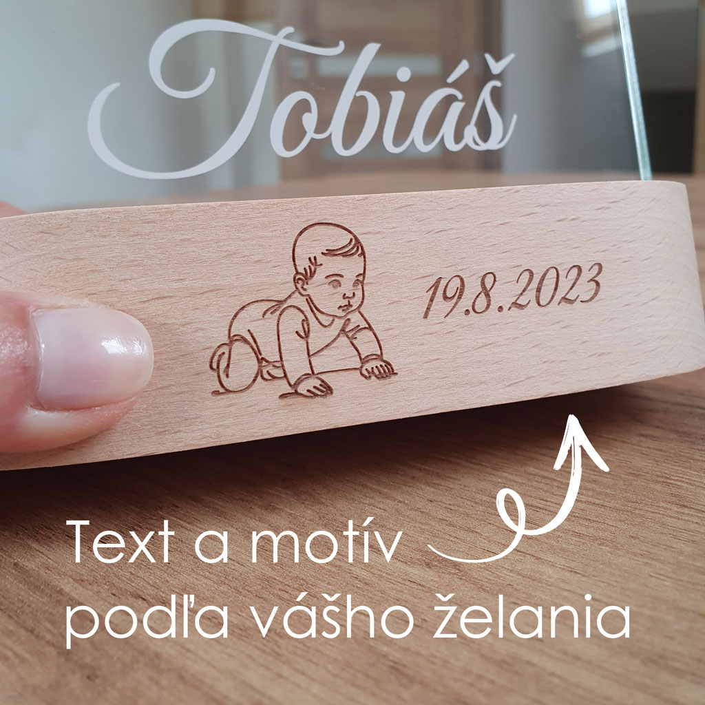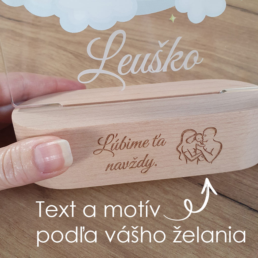 Ako postupovať: Meno dieťatka napíšte do políčka pri výrobku. Ak si prajete pridať venovanie aj na drevený podstavec lampičky, tak stačí označiť možnosť (Gravírovanie na podstavec + 5 €) a napísať želaný text. Po prijatí objednávky Vám pošleme na email meno aj Váš text vo viacerých typoch písma na výber.