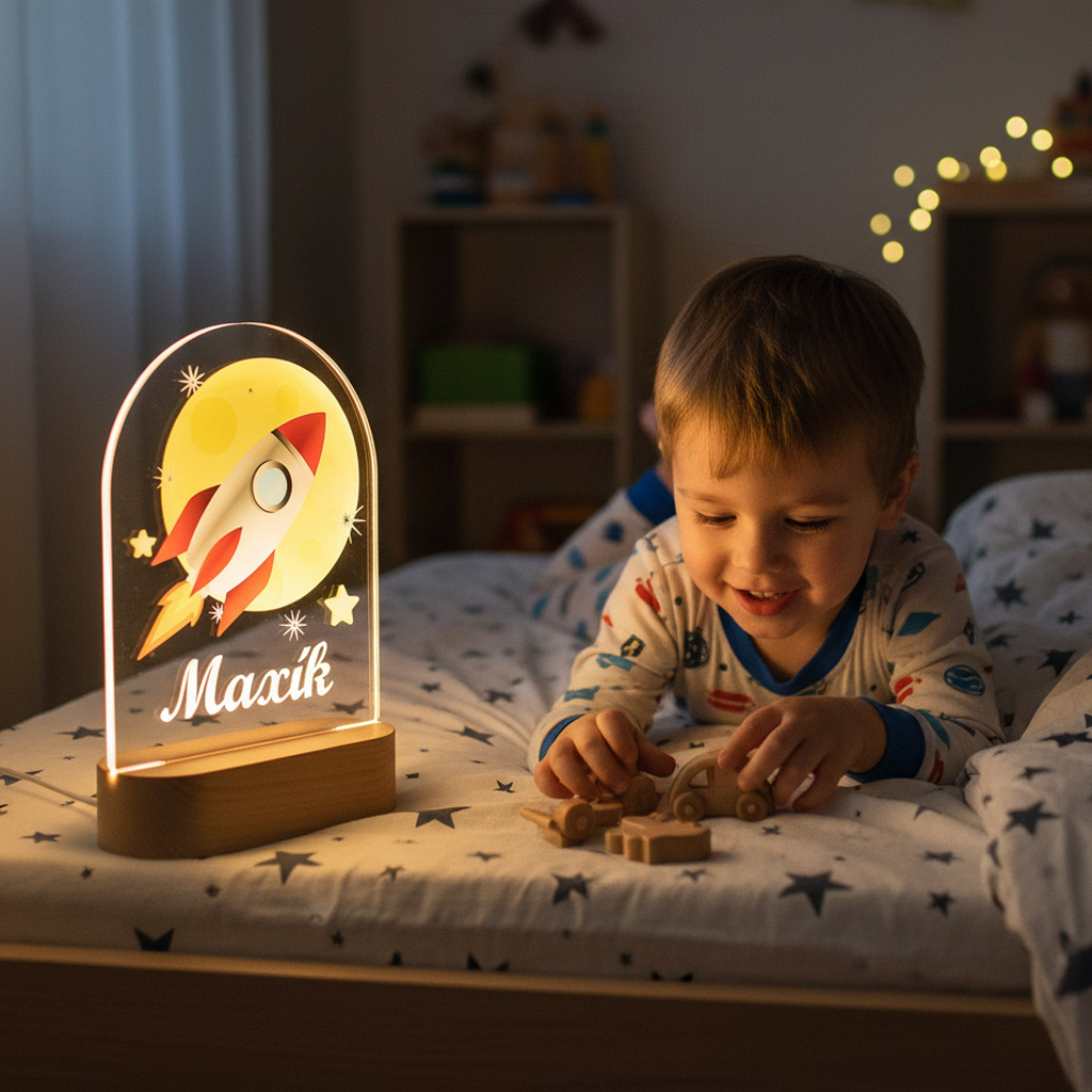 LED nočná lampa s vlastným menom dieťatka a motívom vesmírnej rakety rozžiari nielen detskú izbičku, ale aj očká detí. Je to tiež ideálny darček k narodeniu dieťatka, na krstiny, narodeniny, či meniny.