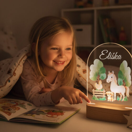 Detská nočná lampa s menom dieťatka a s možnosťou gravírovania motívu a textu podľa želania aj na drevený podstavec 🎁