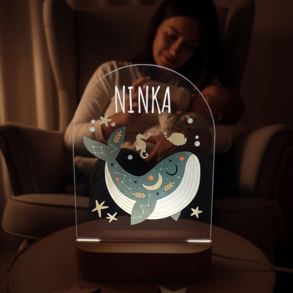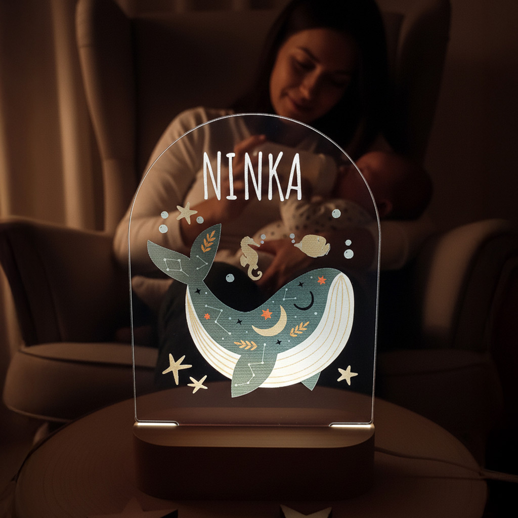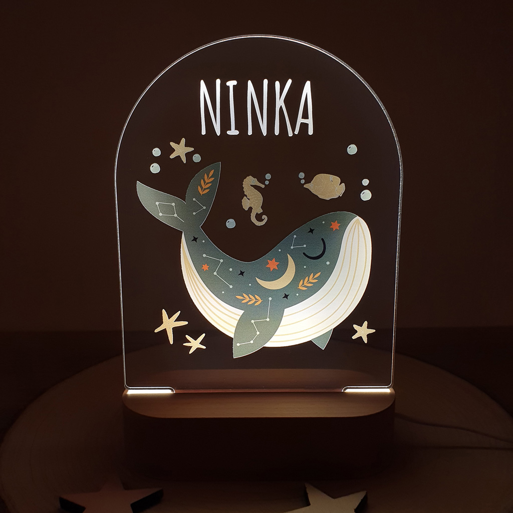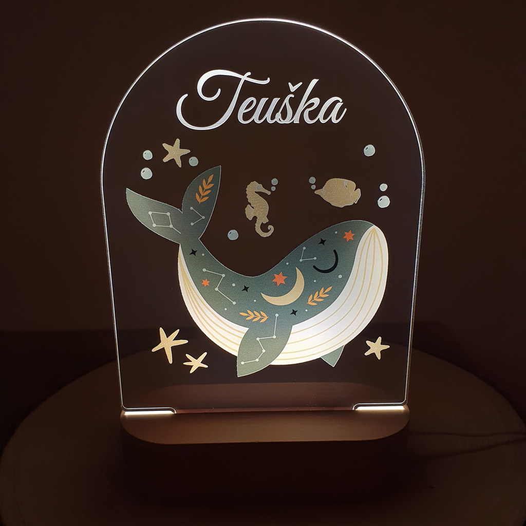 LED nočná lampa s vlastným menom dieťatka a motívom veľryby rozžiari nielen detskú izbičku, ale aj očká detí. Je to tiež ideálny darček k narodeniu dieťatka, na krstiny, narodeniny, či meniny.