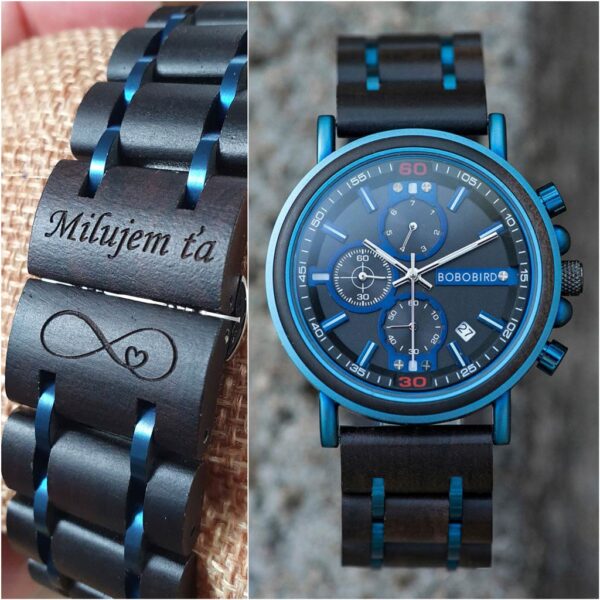 - Na hodinky si môžete pridať vlastné venovanie (text a motív) ktorý vám vygravírujeme podľa vášho želania na: Zadnú stranu hodiniek (nerezová oceľ), Remienok a Drevenú krabičku.
