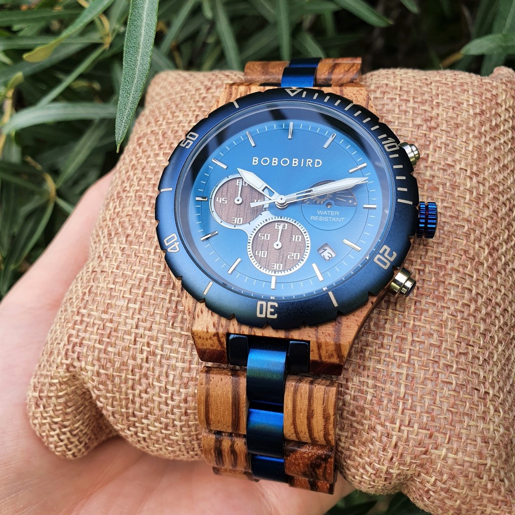sa vďaka svojmu výraznému a nadčasovému dizajnu stanú obľúbeným pánskym doplnkom, ktorý doladí k dokonalosti každý elegantný aj športový outfit. Hodinky sú vyrobené zo zebrového dreva a kombinácie vysokokvalitnej nerezovej ocele v modrej farbe . Hodinky disponujú praktickými funkciami zobrazovania dátumu, grafickým zobrazením dňa a noci a chronografom (stopky).