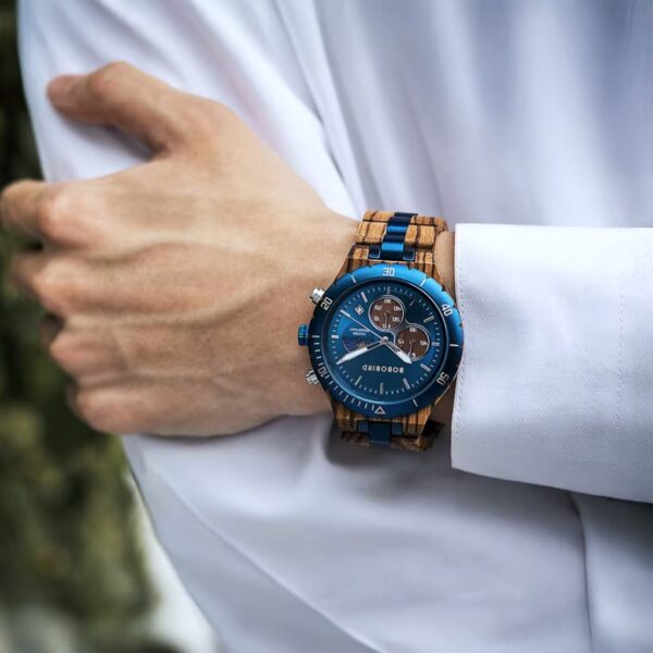 sa vďaka svojmu výraznému a nadčasovému dizajnu stanú obľúbeným pánskym doplnkom, ktorý doladí k dokonalosti každý elegantný aj športový outfit. Hodinky sú vyrobené zo zebrového dreva a kombinácie vysokokvalitnej nerezovej ocele v modrej farbe . Hodinky disponujú praktickými funkciami zobrazovania dátumu, grafickým zobrazením dňa a noci a chronografom (stopky).