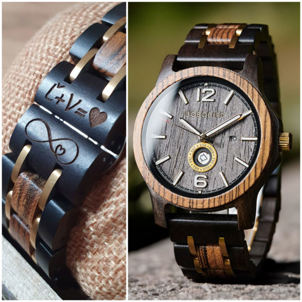 • Na hodinky si môžete pridať vlastné venovanie (text a motív) ktorý vám vygravírujeme podľa vášho želania: na zadnú stranu hodiniek, remienok a drevenú krabičku.