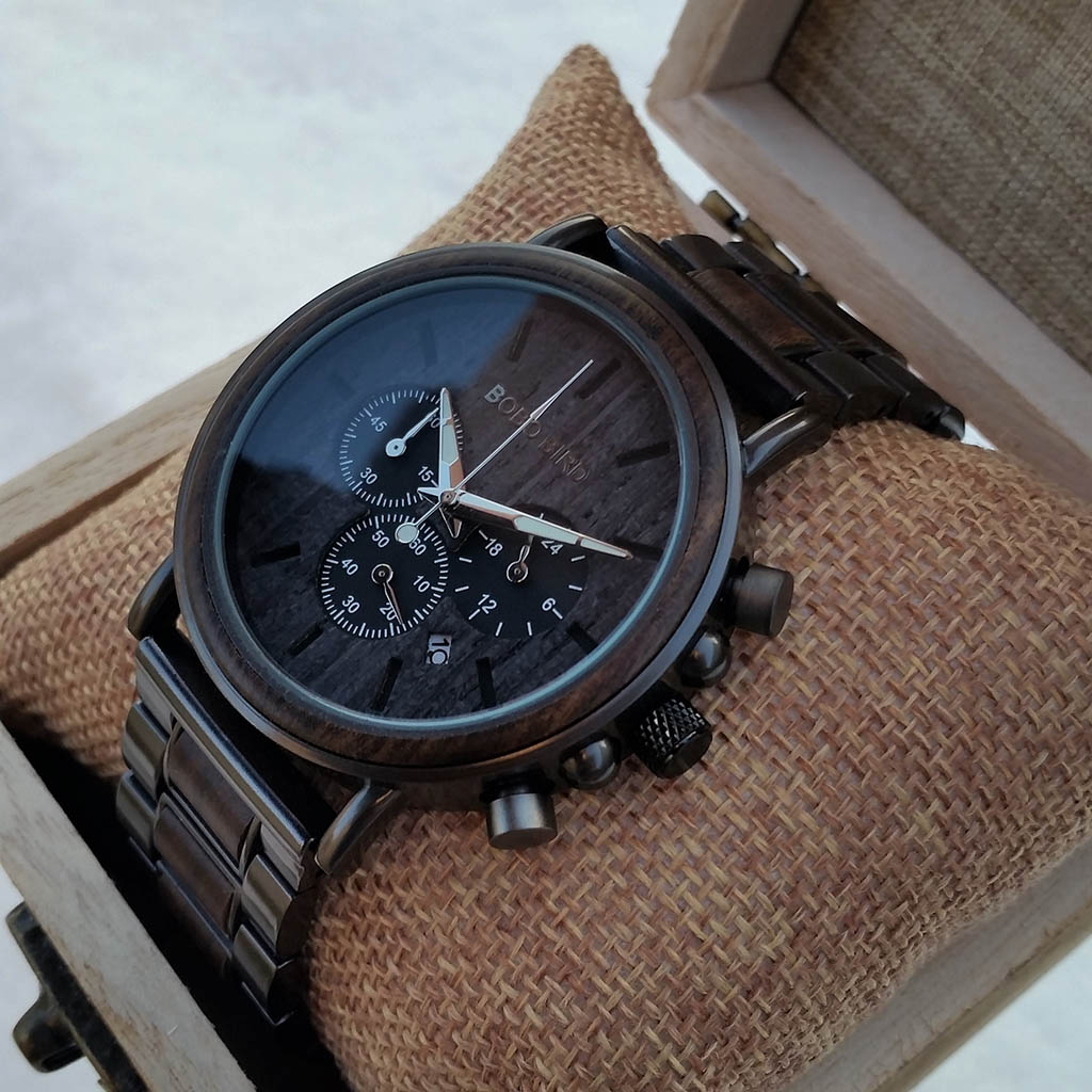 doladia a zvýraznia každý outfit a stanú sa obľúbeným doplnkom každého muža. Hodinky sú vyrobené z ebenového dreva a kombinácie nerezovej ocele. Ciferník disponuje funkciami chronografu (stopky) a funkciou zobrazovania dátumu.