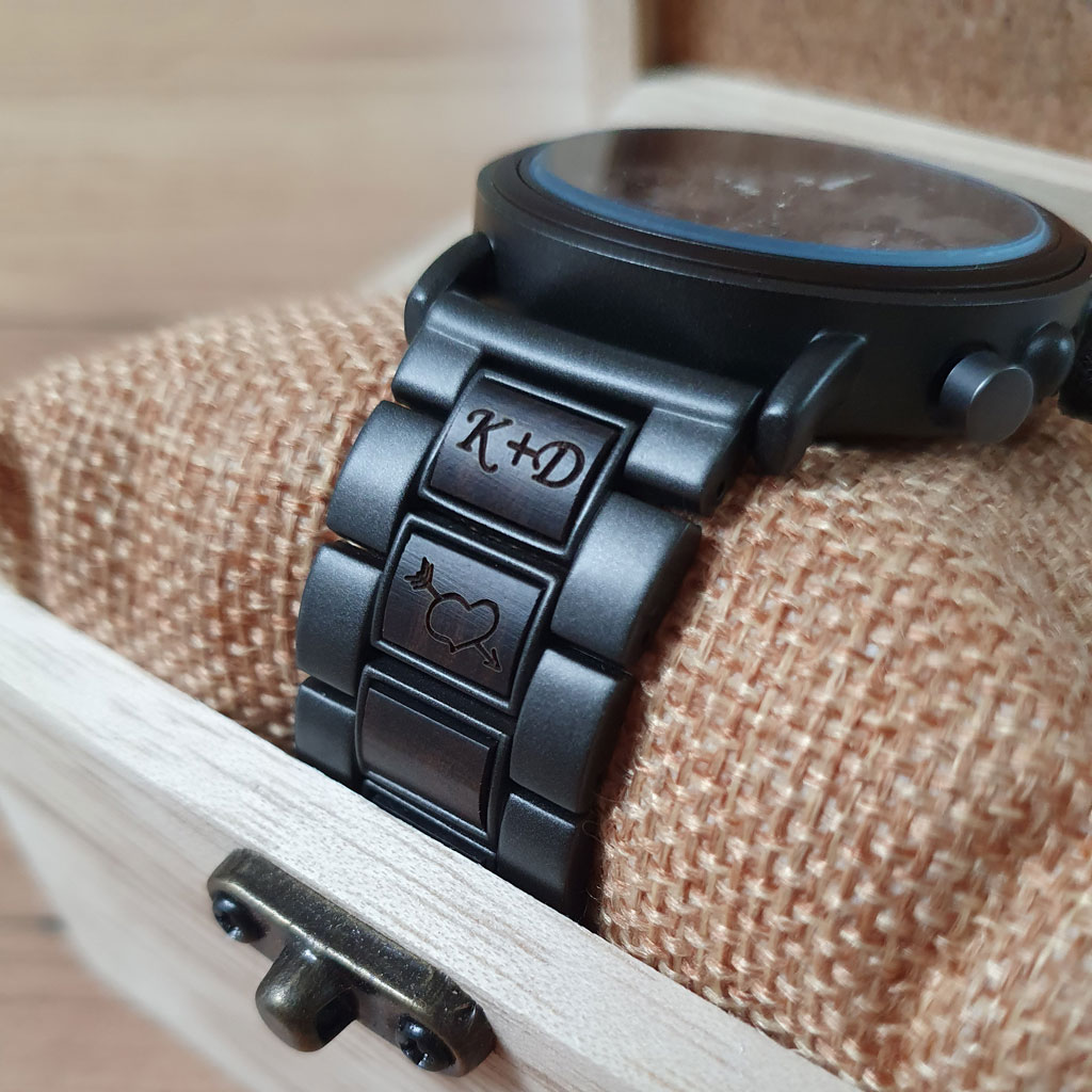 - Na hodinky si môžete pridať vlastné venovanie (text a motív) ktorý vám vygravírujeme podľa vášho želania na: Zadnú stranu hodiniek (nerezová oceľ), Remienok a Drevenú krabičku.