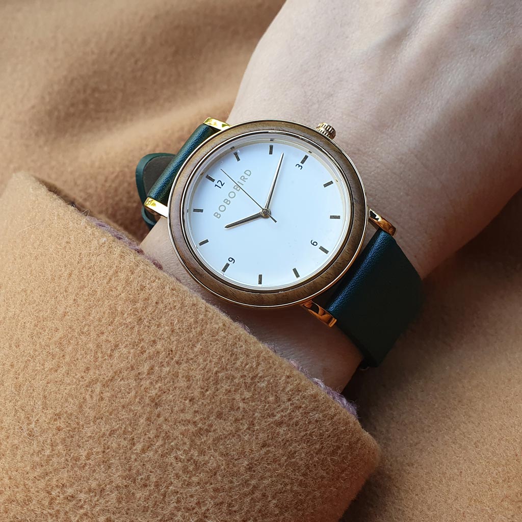 - Hodinky sú vyrobené zo zeleného santalového dreva a nerezovej ocele v zlatej farbe.