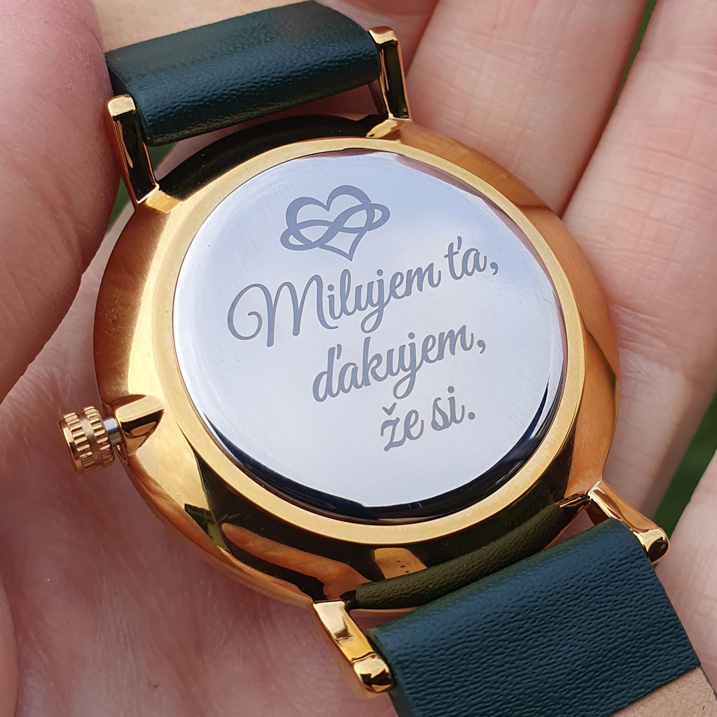 - Na hodinky si môžete pridať vlastné venovanie (text a motív) ktorý vám vygravírujeme podľa vášho želania na: Zadnú stranu hodiniek (nerezová oceľ) a Drevenú krabičku.