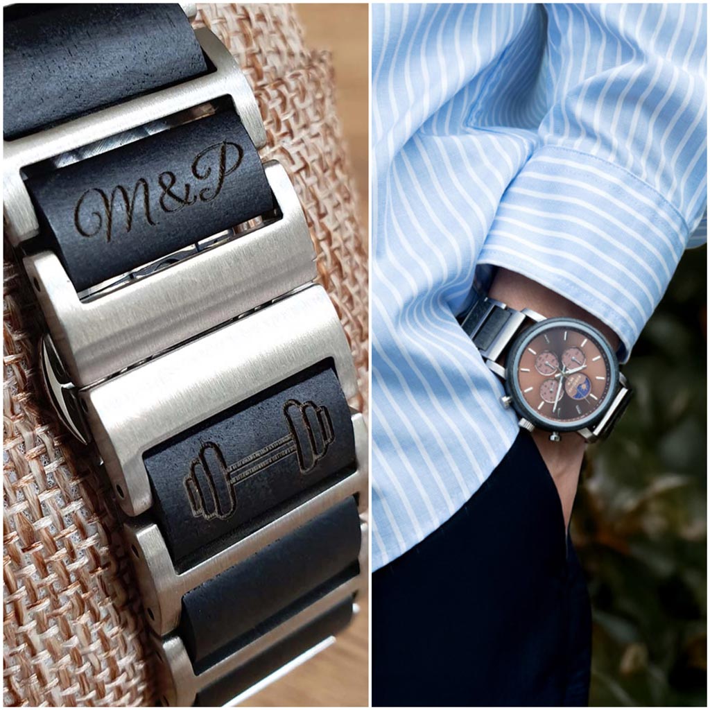 - Na hodinky si môžete pridať vlastné venovanie (text a motív) ktorý vám vygravírujeme podľa vášho želania na: Zadnú stranu hodiniek (nerezová oceľ), Remienok a Drevenú krabičku.