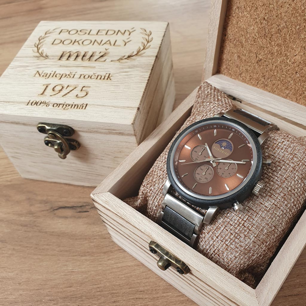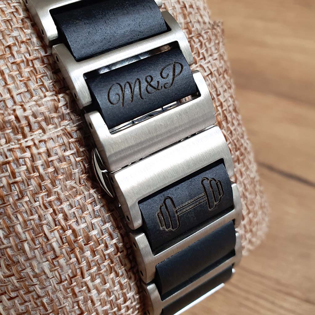 - Na hodinky si môžete pridať vlastné venovanie (text a motív) ktorý vám vygravírujeme podľa vášho želania na: Zadnú stranu hodiniek (nerezová oceľ), Remienok a Drevenú krabičku.