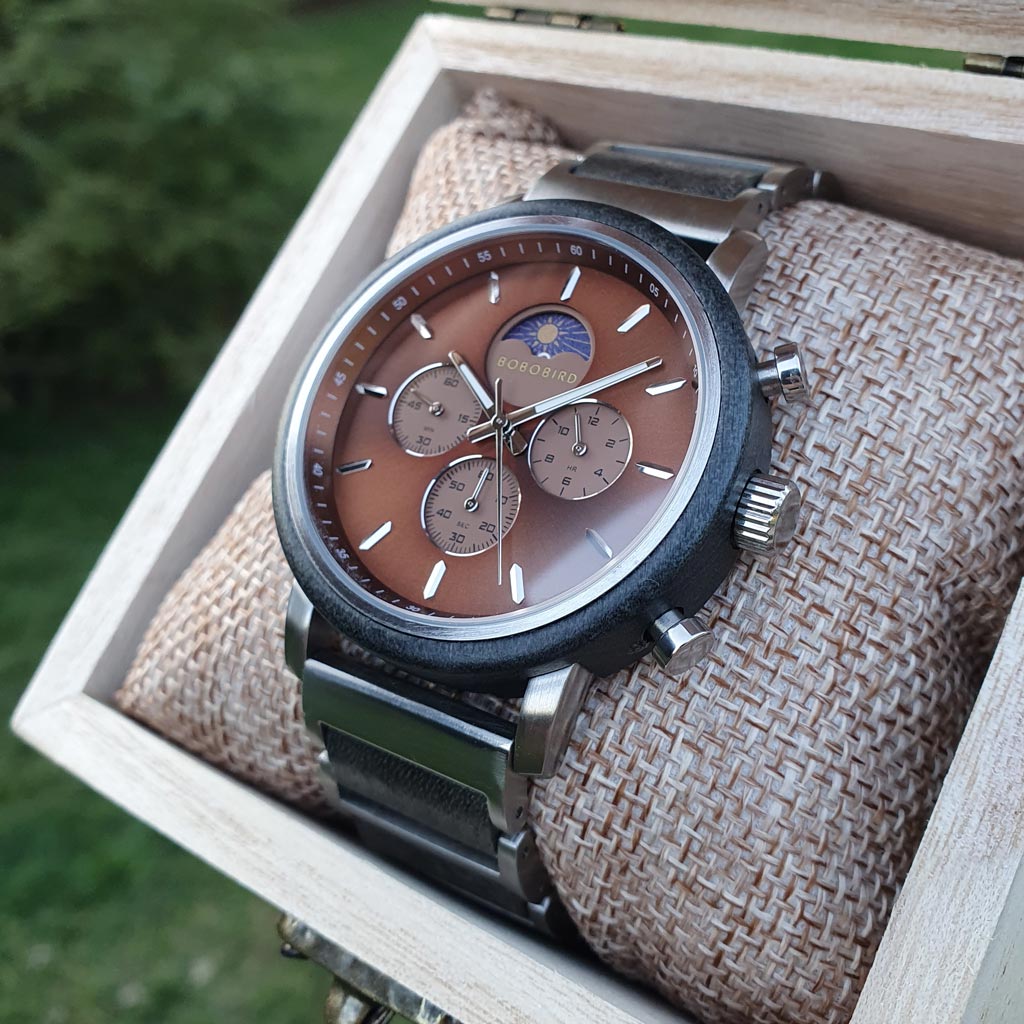 sa vďaka svojmu výraznému a nadčasovému dizajnu stanú obľúbeným pánskym doplnkom, ktorý doladí k dokonalosti každý elegantný aj športový outfit. Hodinky sú vyrobené zo šedého javorového dreva a kombinácie vysokokvalitnej nerezovej ocele. Hodinky disponujú praktickými funkciami zobrazovania dátumu, grafickým zobrazením dňa a noci a chronografom (stopky).