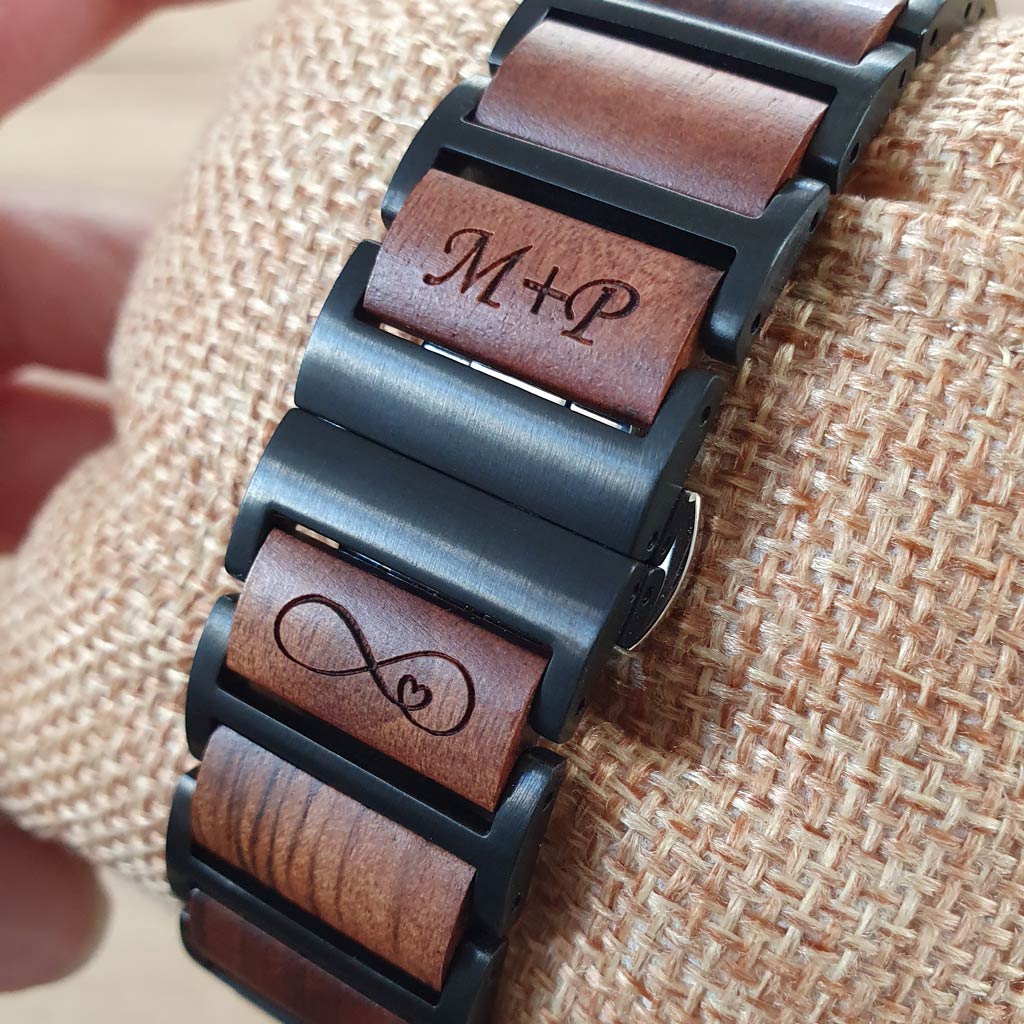 • Na hodinky si môžete pridať vlastné venovanie (text a motív) ktorý vám vygravírujeme podľa vášho želania na: Zadnú stranu hodiniek (nerezová oceľ), Remienok a Drevenú krabičku.