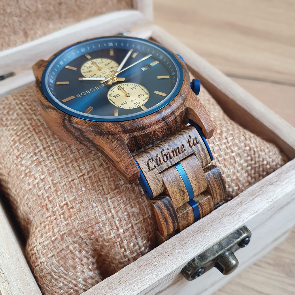 - Na hodinky si môžete pridať vlastné venovanie (text a motív) ktorý vám vygravírujeme podľa vášho želania na: Zadnú stranu hodiniek (nerezová oceľ), Remienok a Drevenú krabičku.