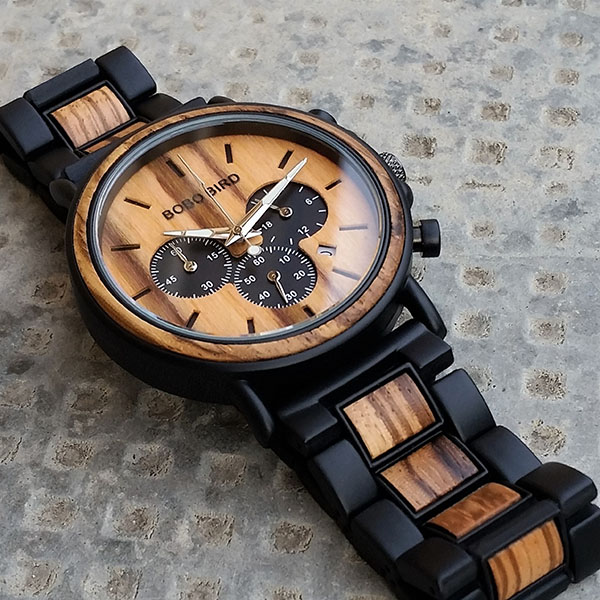 doladia a zvýraznia každý outfit a stanú sa obľúbeným doplnkom každého muža. Hodinky sú vyrobené zo zebrového dreva a kombinácie nerezovej ocele. Výrazný ciferník disponuje funkciami chronografu (stopky) a funkciou zobrazovania dátumu.