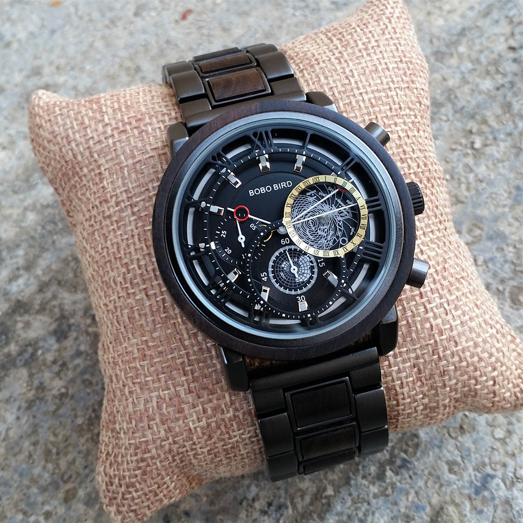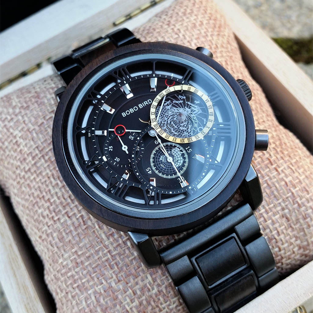 s nadčasovým dizajnom doladia a zvýraznia každý outfit a stanú sa obľúbeným doplnkom každého muža. Hodinky sú vyrobené z ebenového dreva a kombinácie nerezovej ocele. Ciferník disponuje funkciami chronografu (stopky) a funkciou zobrazovania dátumu.