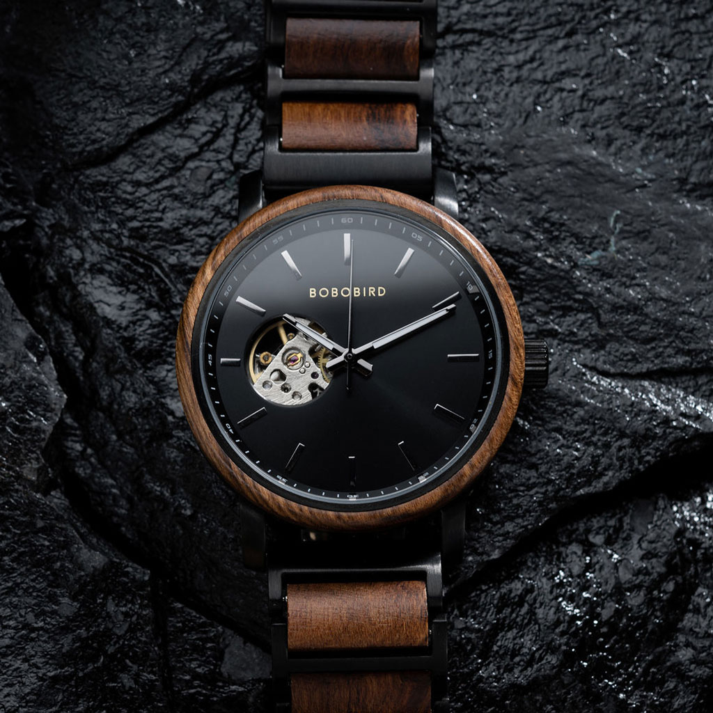 s automatickým naťahovaním vyrobené z ebenového – tigrovaného dreva a vysokokvalitnej nerezovej ocele. Ich výnimočný dizajn umocňuje viditeľnosť dokonale prepracovaného vnútorného mechanizmu. Srdcom hodiniek je mechanický strojček, ktorý je viditeľný z oboch strán puzdra. Hodinky nepotrebujú batériu, ich pohon je zabezpečený prirodzeným pohybom vašej ruky. Ručičky a indexy zobrazovania času sú luminiscenčné (fosforové).