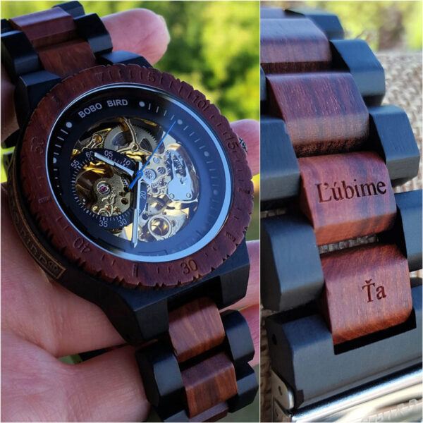 s automatickým naťahovaním sú vyrobené z ebenového a santalového dreva. Ich výnimočný dizajn umocňuje viditeľnosť dokonale prepracovaného vnútorného mechanizmu. Srdcom hodiniek je mechanický strojček, ktorý je viditeľný z oboch strán puzdra. Hodinky nepotrebujú batériu, ich pohon je zabezpečený prirodzeným pohybom vašej ruky. Ručičky a indexy zobrazovania času sú luminiscenčné (fosforové). Remienok na hodinkách je možné prispôsobiť podľa potreby.