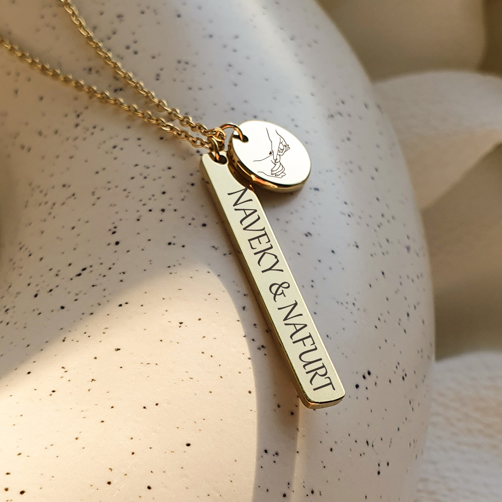 Set náhrdelníkov PROMISE s gravírovaním – zlatý prívesok s menami a jemný vrstvený náhrdelník z chirurgickej ocele