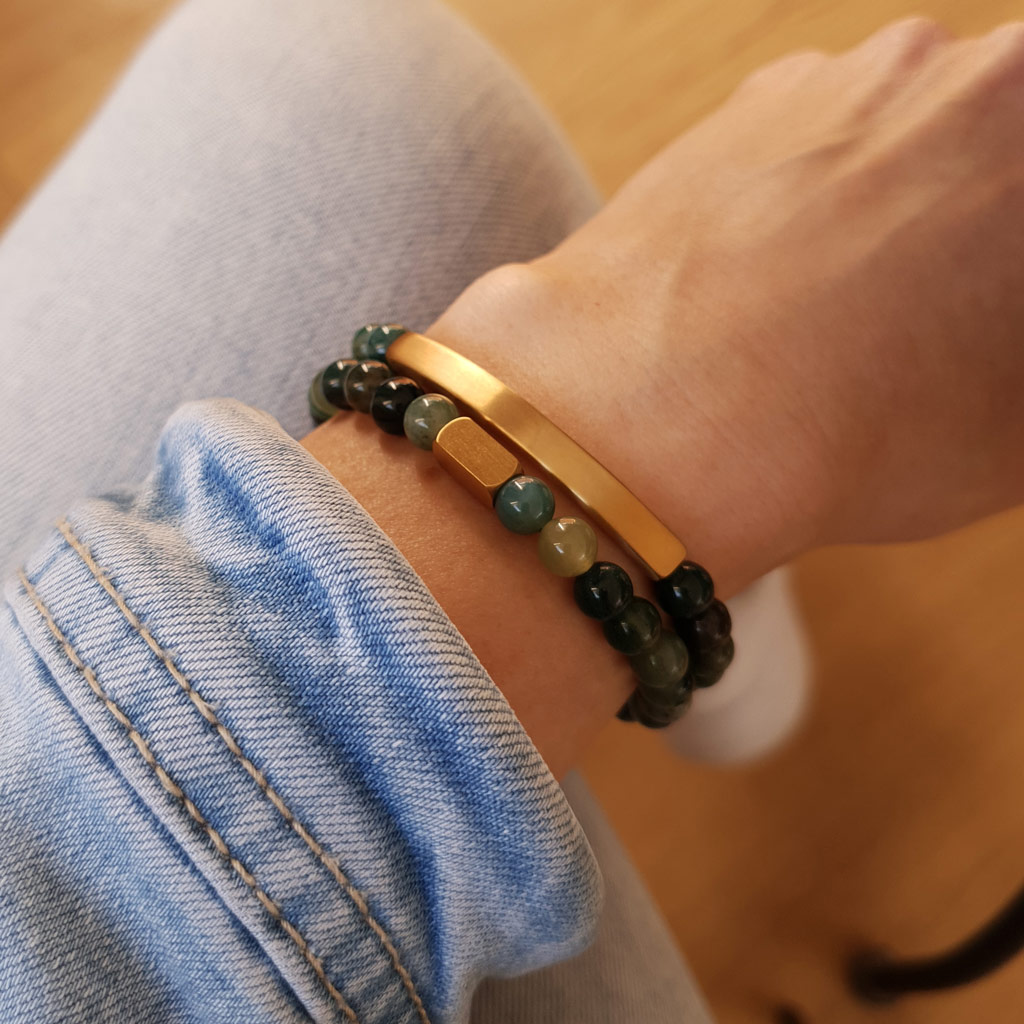Elegantný personalizovaný náramok z prírodného minerálneho kameňa Achát machový v kombinácii so zlatou chirurgickou oceľou pôsobí luxusne a je ideálny ako osobný darček s vlastným gravírovaním. Môžete si naň pridať vlastný text, meno, dátum alebo symbol.