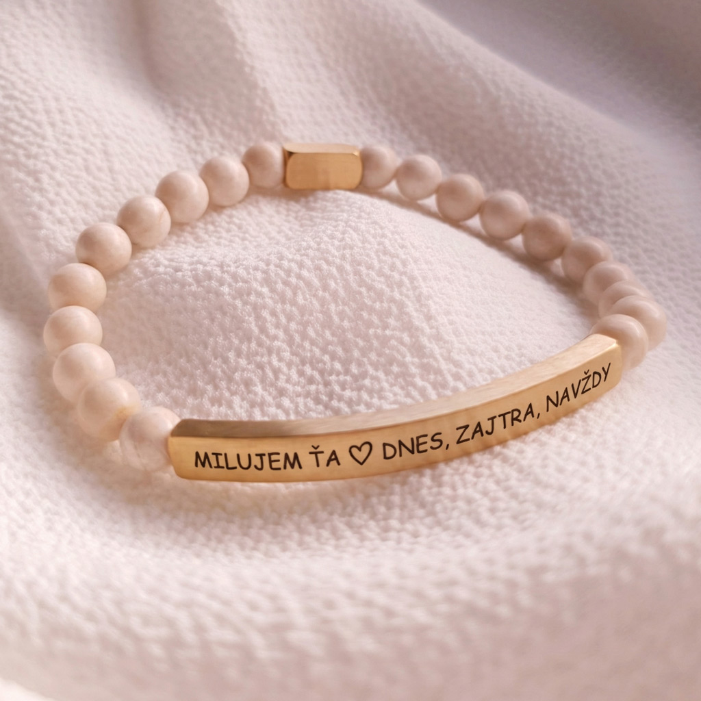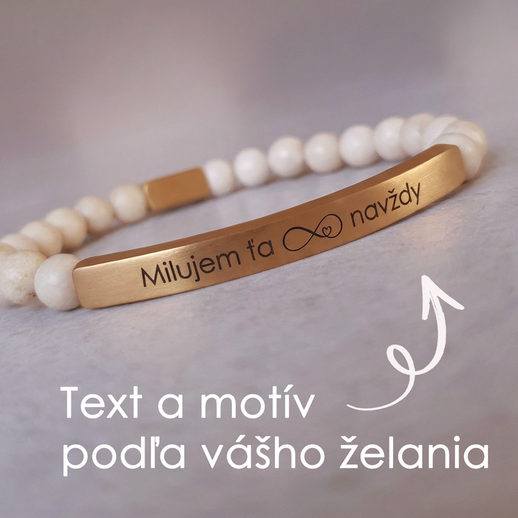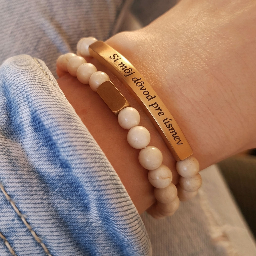 Elegantný personalizovaný náramok z prírodného minerálneho kameňa Magnezit v kombinácii so zlatou chirurgickou oceľou pôsobí luxusne a je ideálny ako osobný darček s vlastným gravírovaním. Môžete si naň pridať vlastný text, meno, dátum alebo symbol.