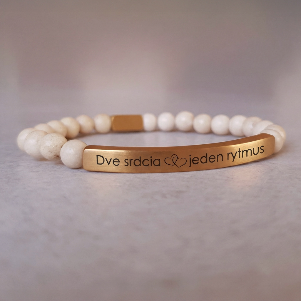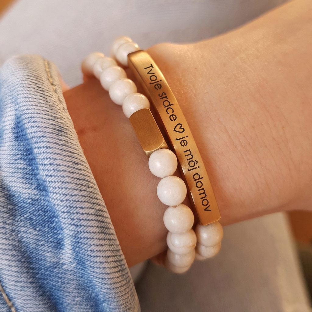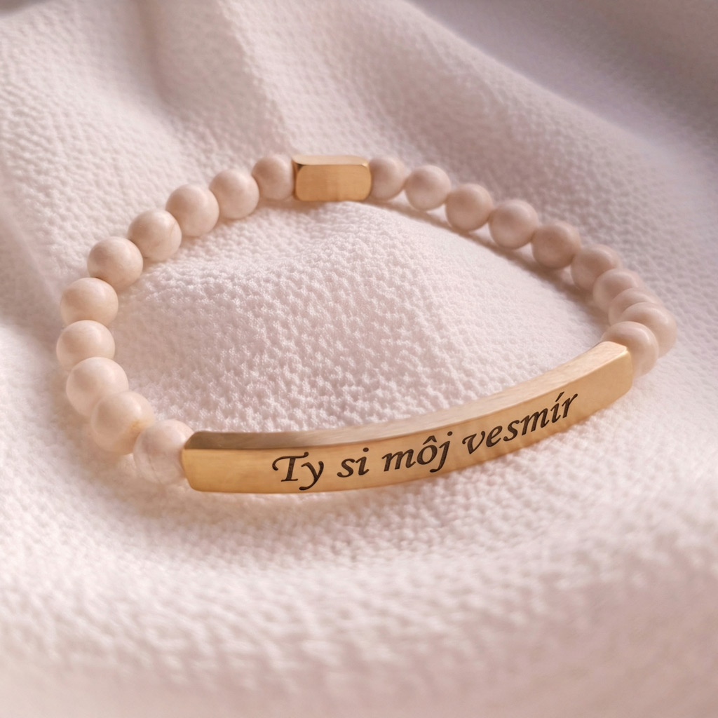 Elegantný personalizovaný náramok z prírodného minerálneho kameňa Magnezit v kombinácii so zlatou chirurgickou oceľou pôsobí luxusne a je ideálny ako osobný darček s vlastným gravírovaním. Môžete si naň pridať vlastný text, meno, dátum alebo symbol.