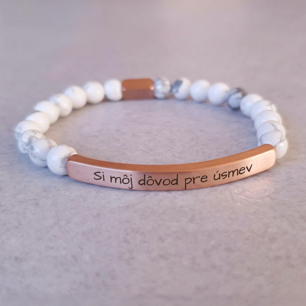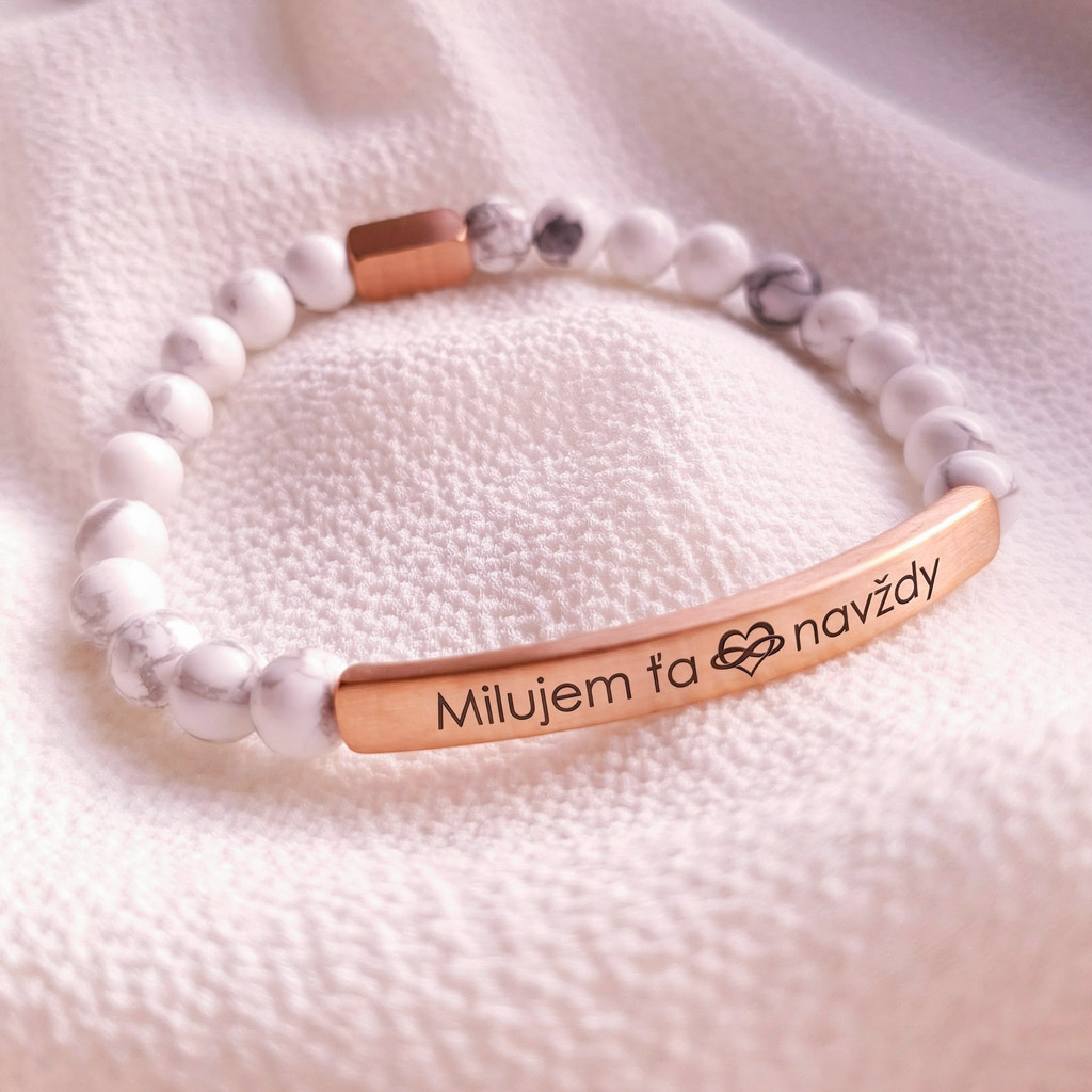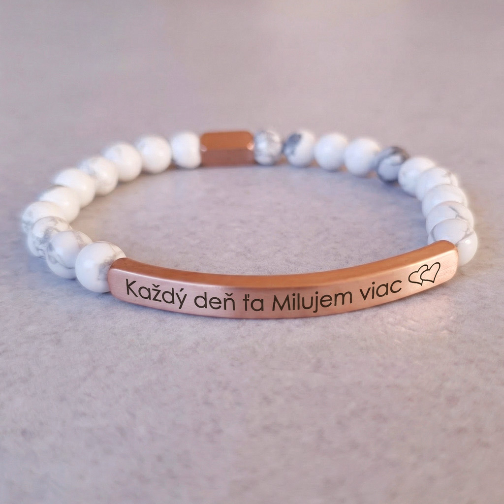 Elegantný personalizovaný náramok z prírodného minerálneho kameňa Howlit v kombinácii s chirurgickou oceľou v odtieni ružového zlata pôsobí luxusne a je ideálny ako osobný darček s vlastným gravírovaním. Môžete si naň pridať vlastný text, meno, dátum alebo symbol.