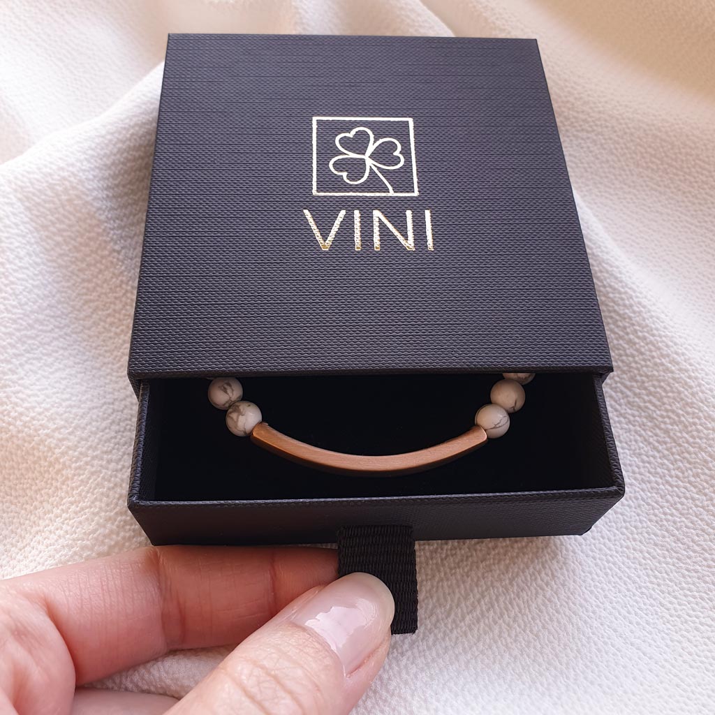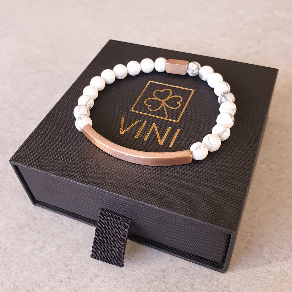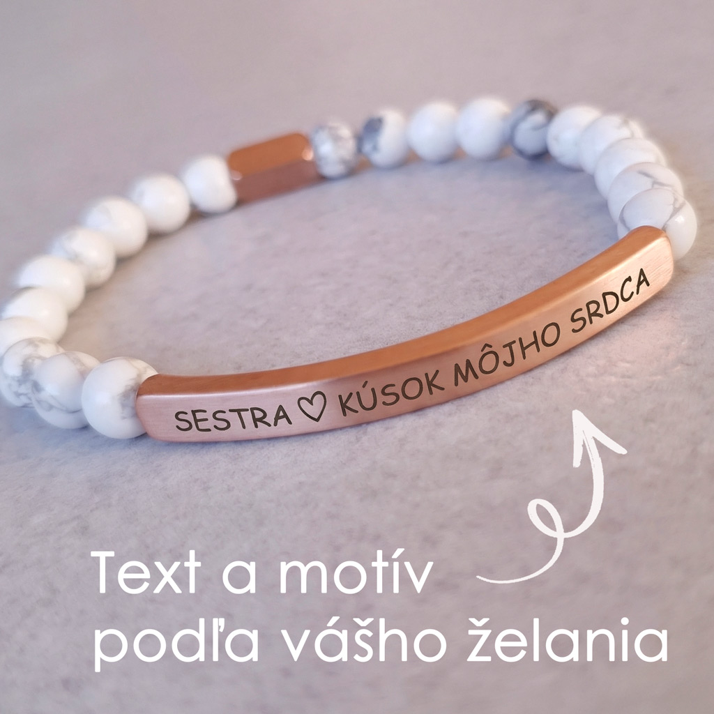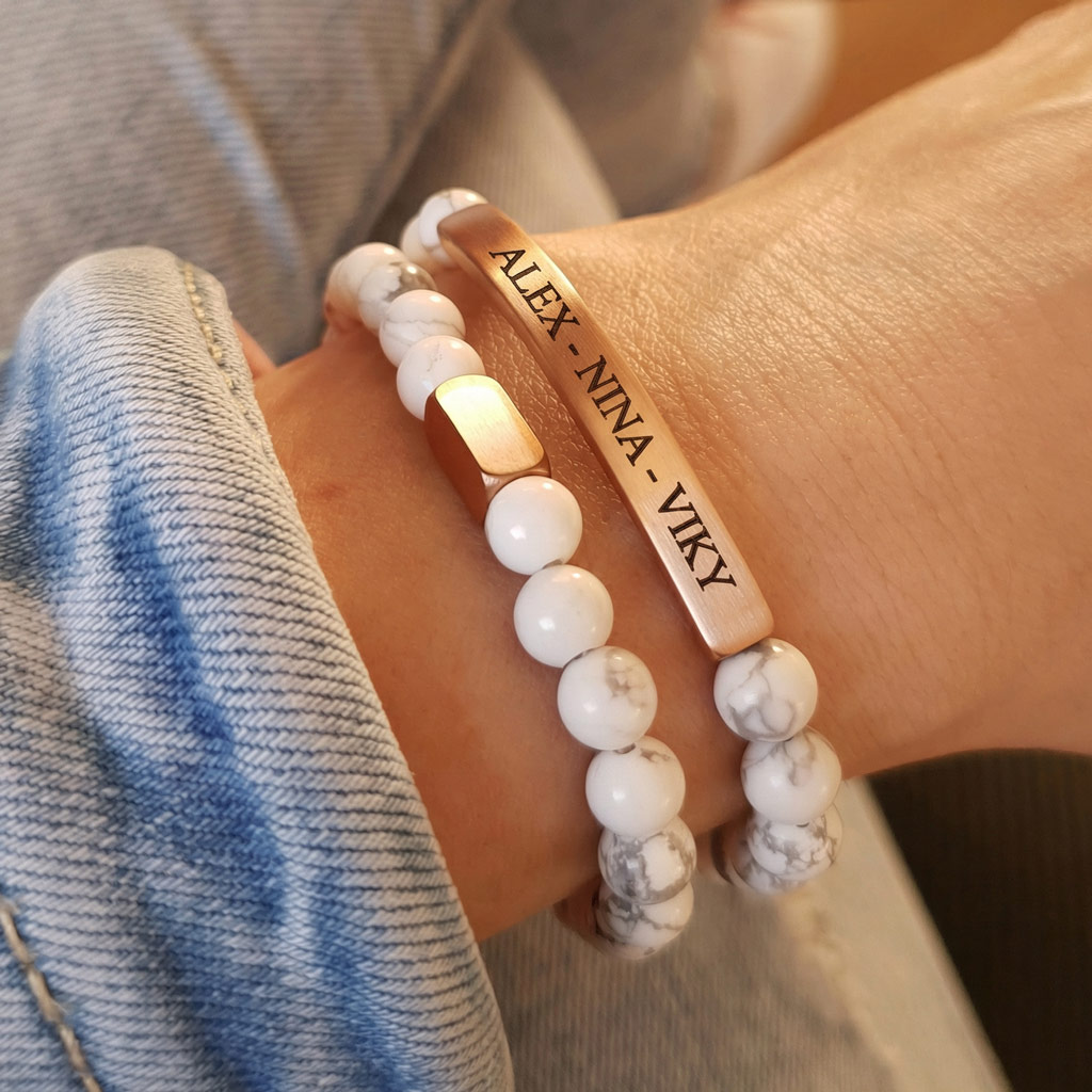 Elegantný personalizovaný náramok z prírodného minerálneho kameňa Howlit v kombinácii s chirurgickou oceľou v odtieni ružového zlata pôsobí luxusne a je ideálny ako osobný darček s vlastným gravírovaním. Môžete si naň pridať vlastný text, meno, dátum alebo symbol.