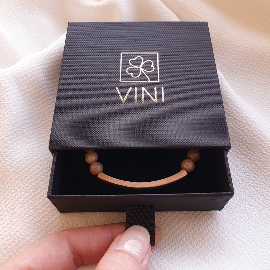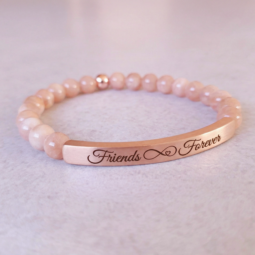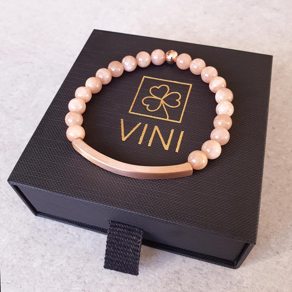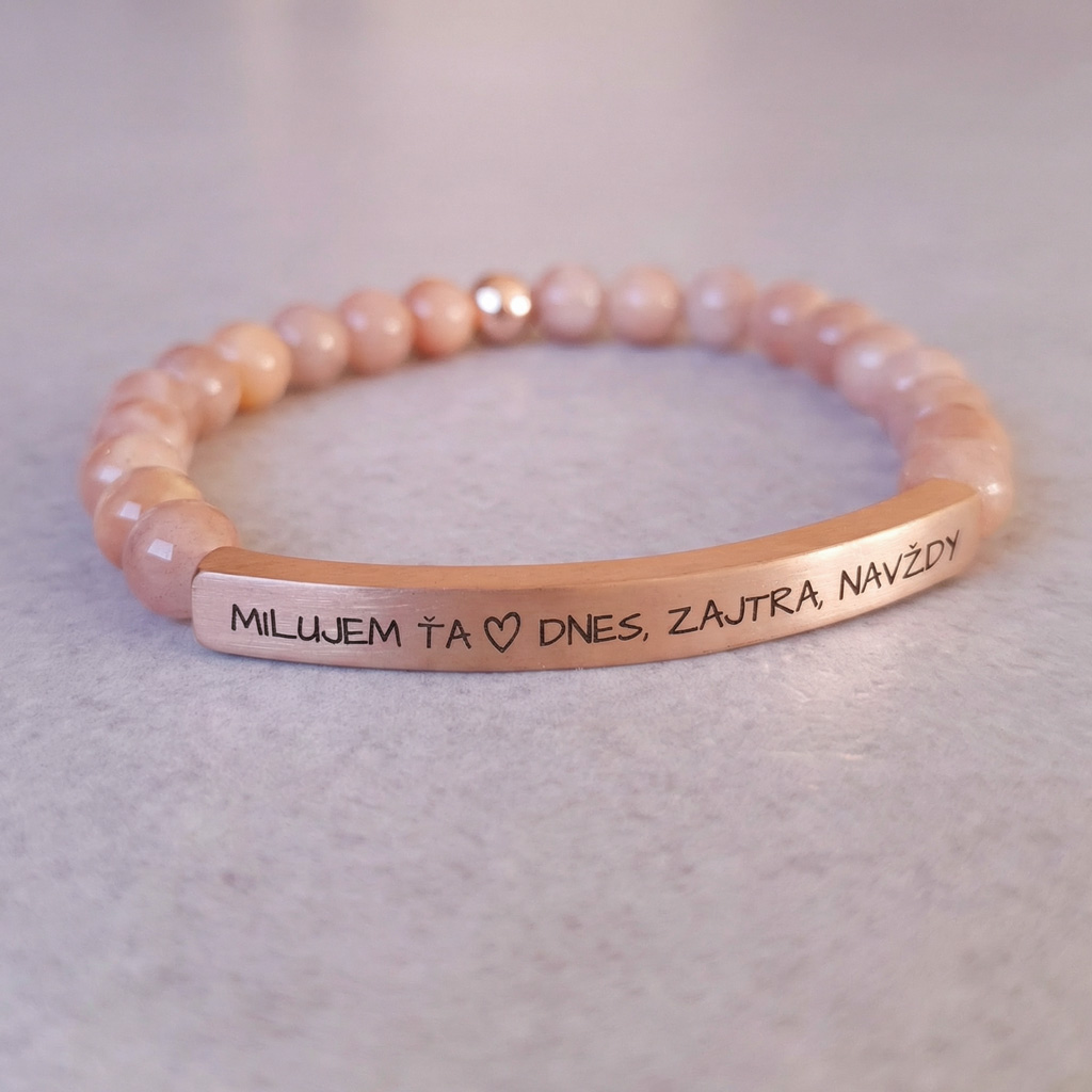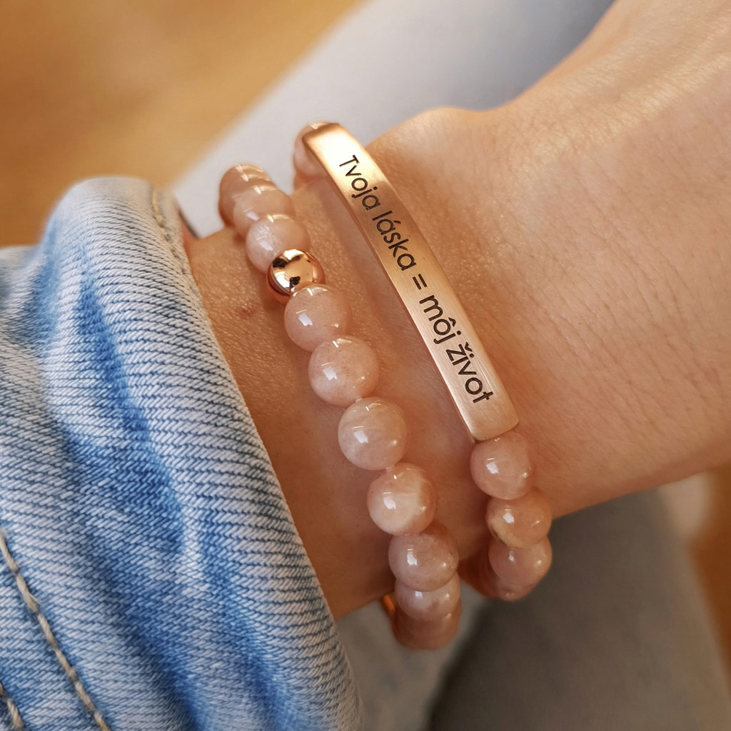 Elegantný personalizovaný náramok z prírodného minerálneho Slnečného kameňa v kombinácii s chirurgickou oceľou v odtieni ružového zlata pôsobí luxusne a je ideálny ako osobný darček s vlastným gravírovaním. Môžete si naň pridať vlastný text, meno, dátum alebo symbol.