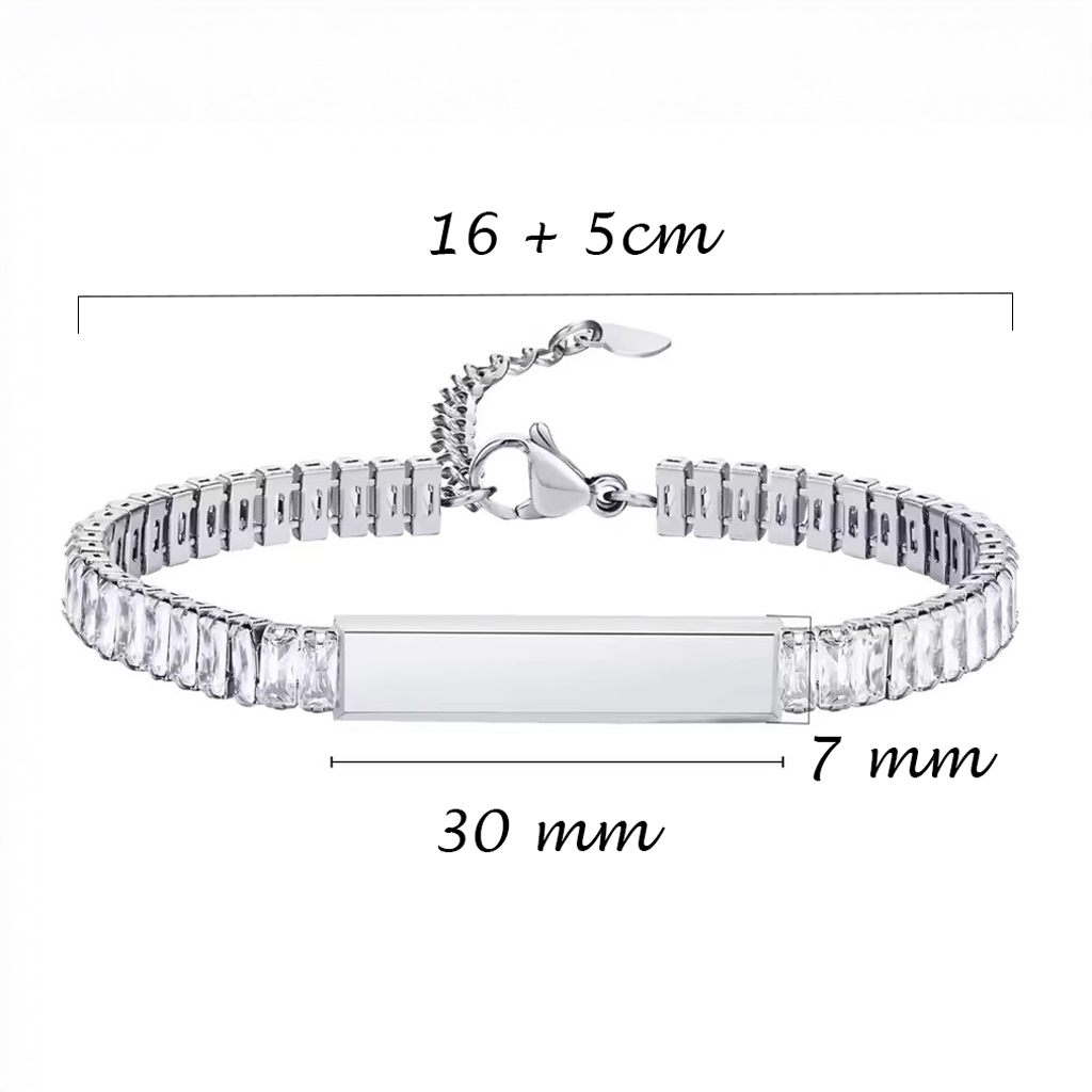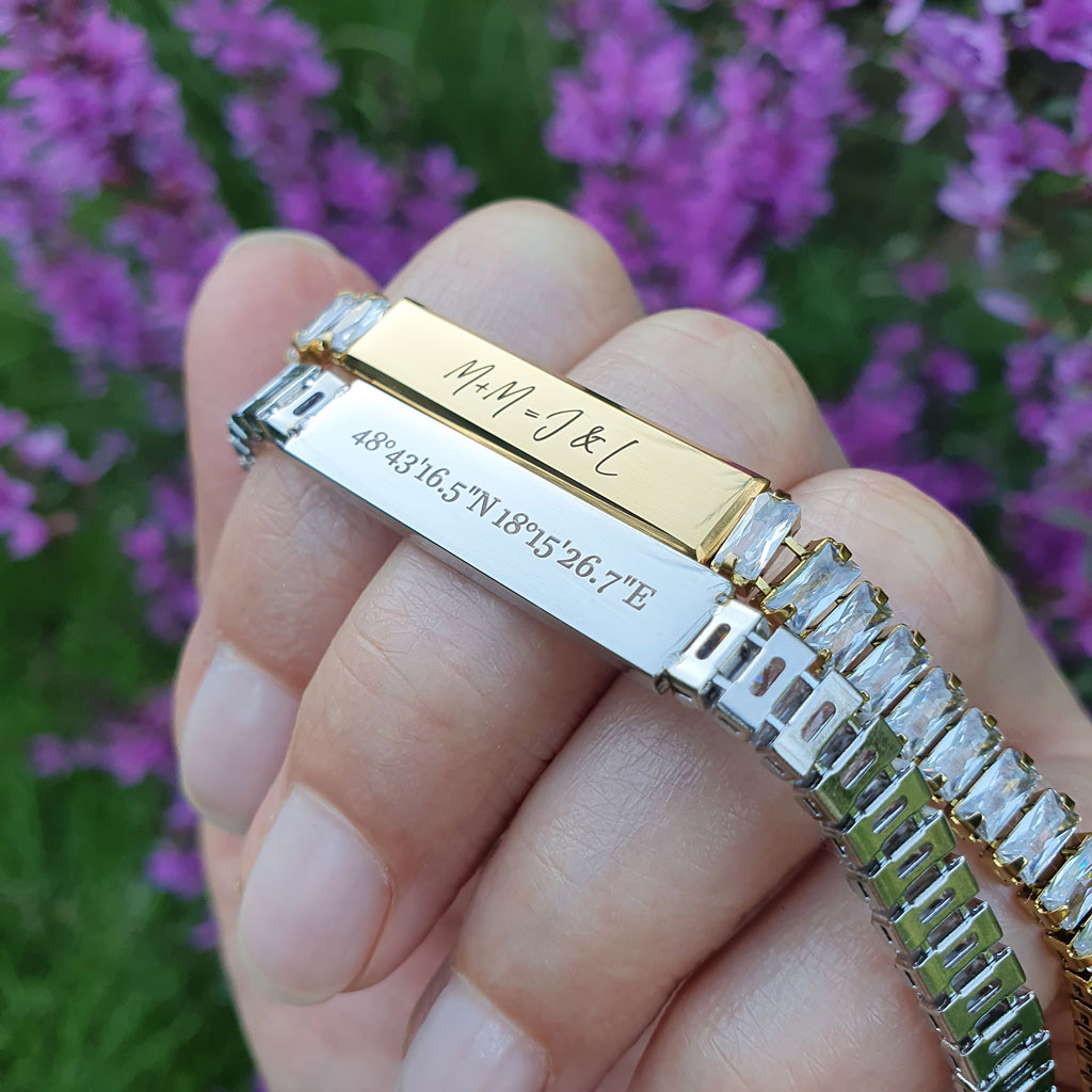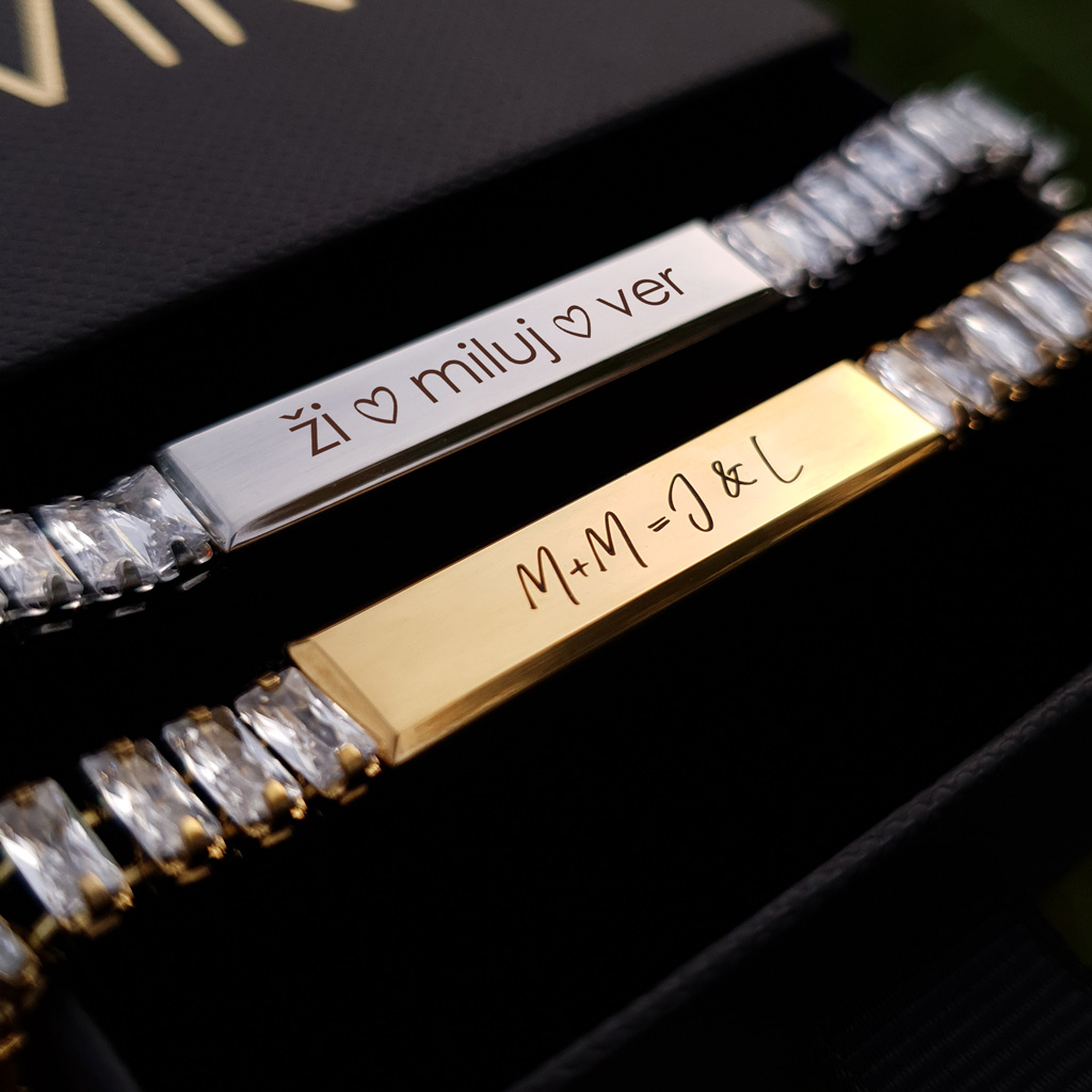 Elegantný náramok so zirkónmi – z kvalitnej chirurgickej ocele s možnosťou gravírovania vlastného textu, mena, dátumu alebo symbolu. Ideálny darček s osobným významom – pre ňu.