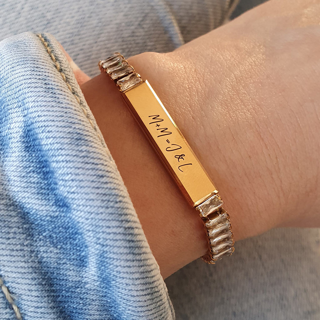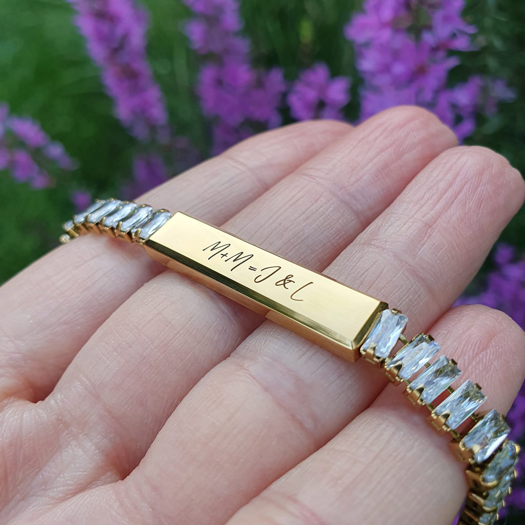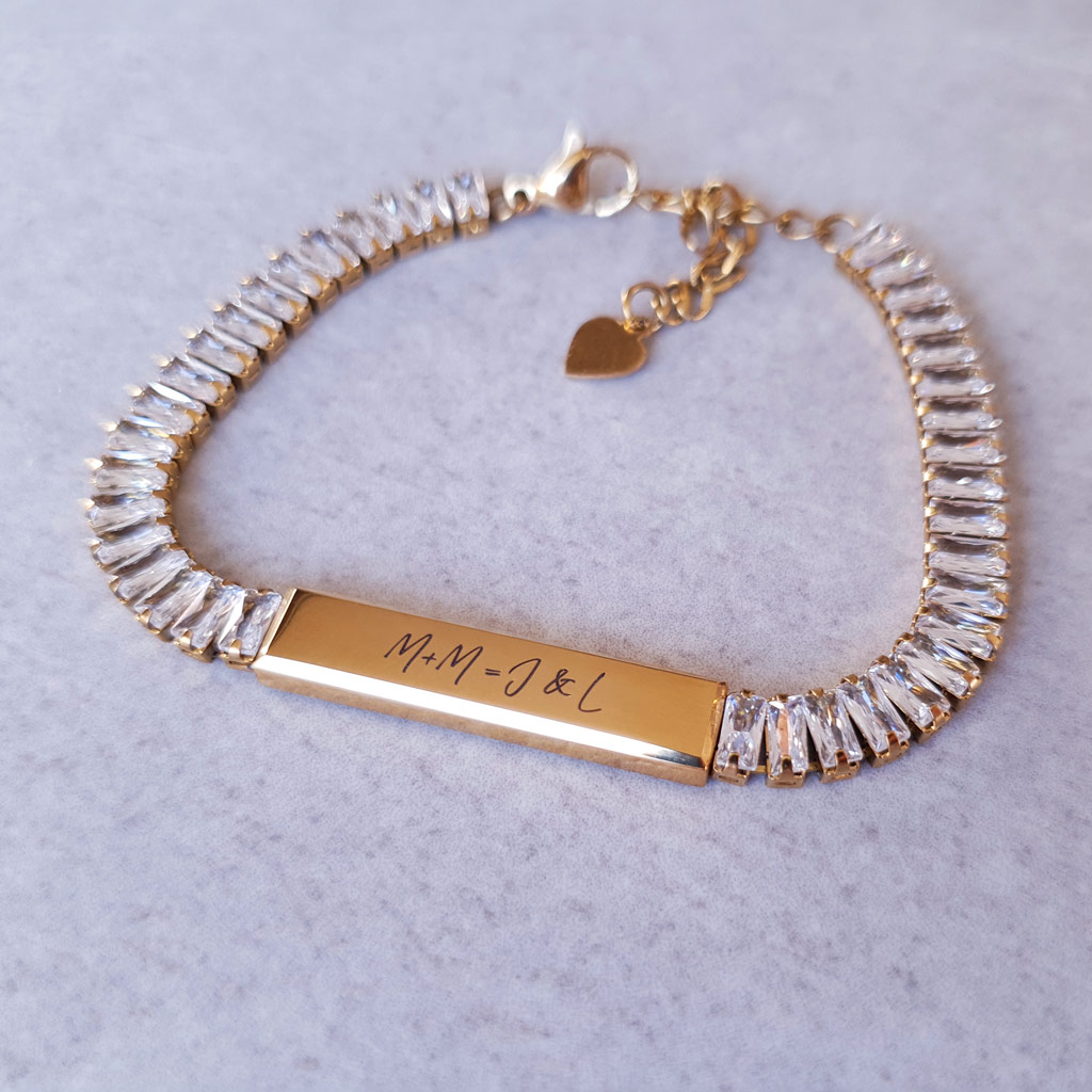Elegantný náramok so zirkónmi – z kvalitnej chirurgickej ocele s možnosťou gravírovania vlastného textu, mena, dátumu alebo symbolu. Ideálny darček s osobným významom – pre ňu.