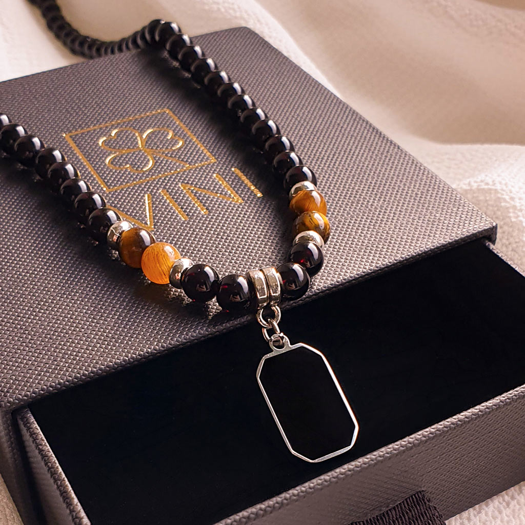 Elegantný pánsky personalizovaný náhrdelník z prírodného ónyxu a tigrieho oka, doplnený o prvok z nerezovej ocele s možnosťou gravírovania vlastného textu, mena, dátumu alebo symbolu. Predná strana prívesku je doplnená o lesklý čierny smalt, ktorý pôsobí elegantne ako čierne sklo a zvýrazňuje nadčasový charakter náhrdelníka.