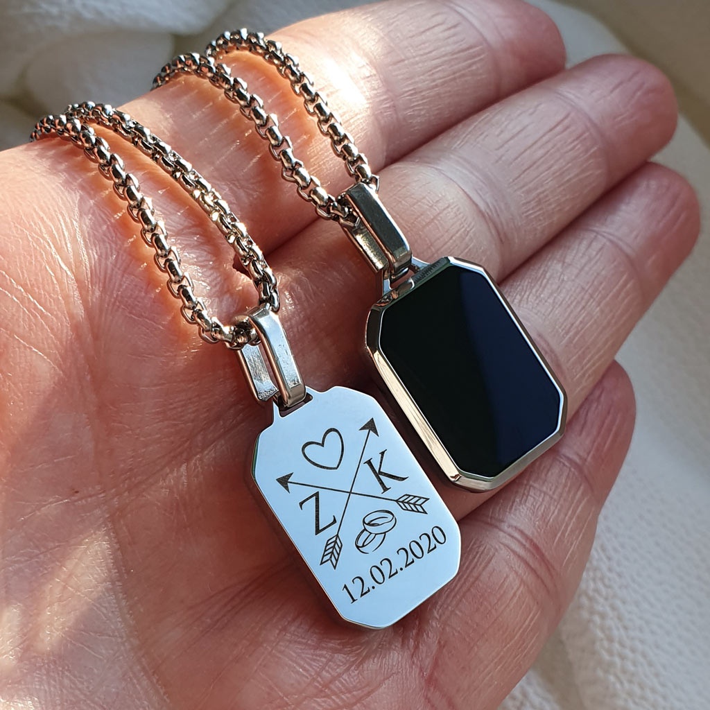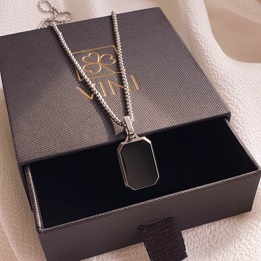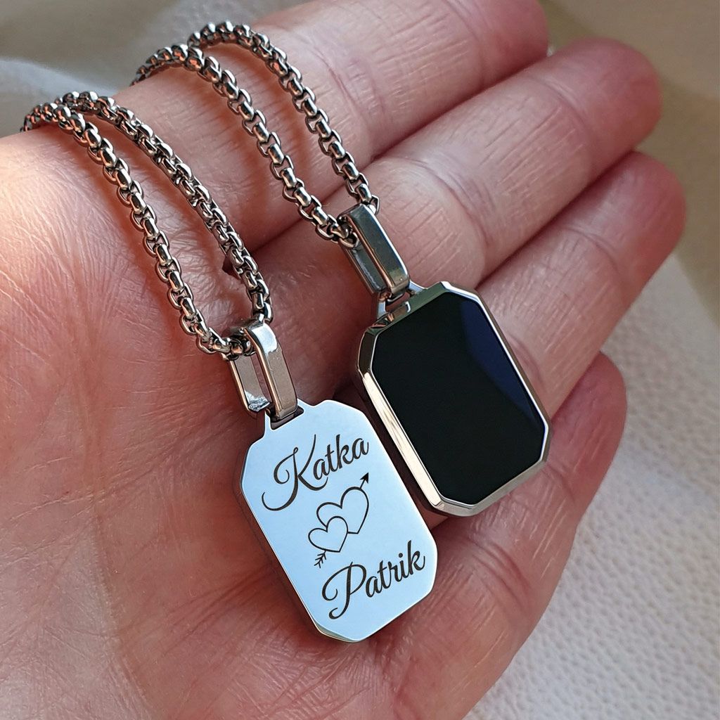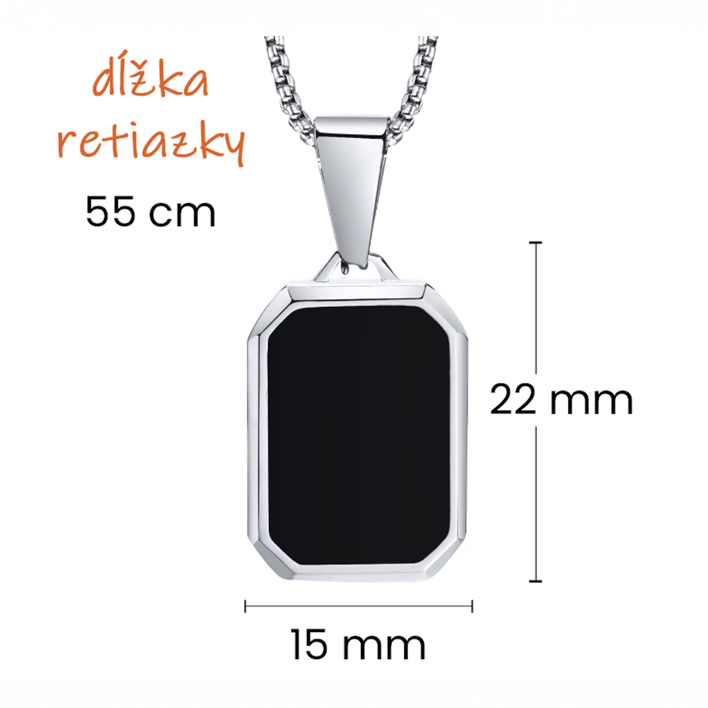 Elegantný pánsky personalizovaný náhrdelník z chirurgickej ocele v nadčasovom prevedení CLASSIC s možnosťou gravírovania vlastného textu, mena, dátumu alebo symbolu. Predná strana prívesku je doplnená o lesklý čierny smalt, ktorý pôsobí elegantne ako čierne sklo a zvýrazňuje nadčasový charakter náhrdelníka.