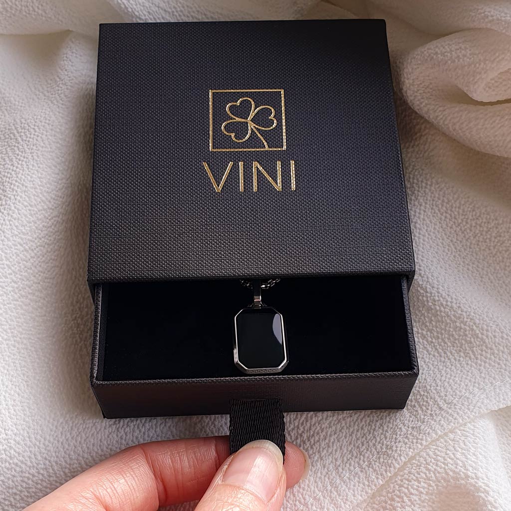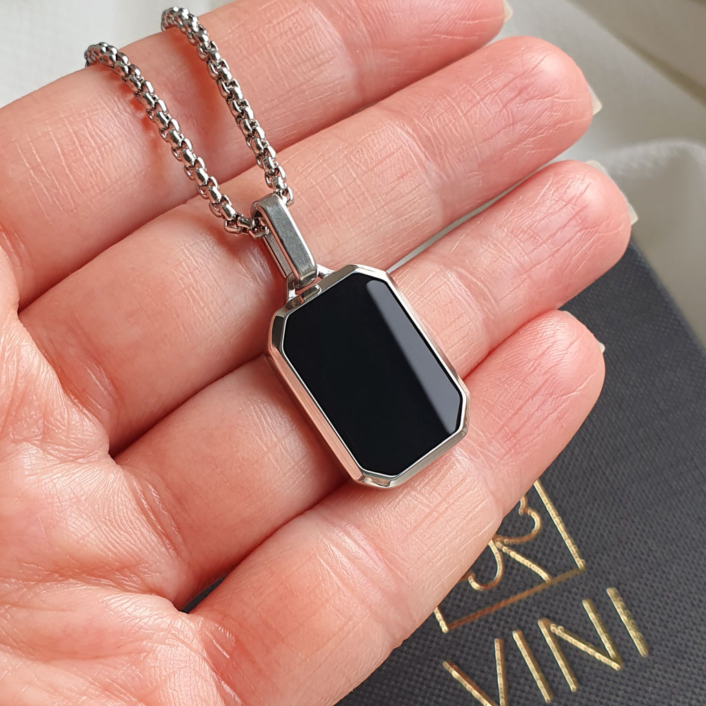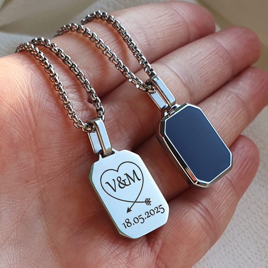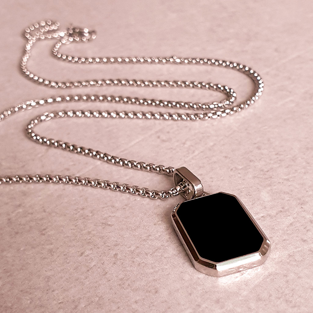 Elegantný pánsky personalizovaný náhrdelník z chirurgickej ocele v nadčasovom prevedení CLASSIC s možnosťou gravírovania vlastného textu, mena, dátumu alebo symbolu. Predná strana prívesku je doplnená o lesklý čierny smalt, ktorý pôsobí elegantne ako čierne sklo a zvýrazňuje nadčasový charakter náhrdelníka.