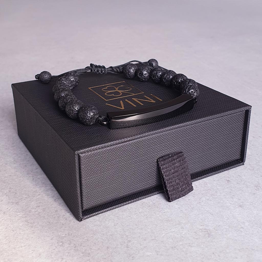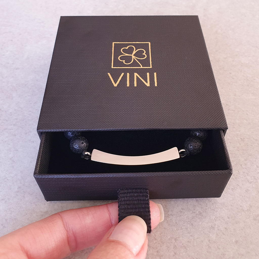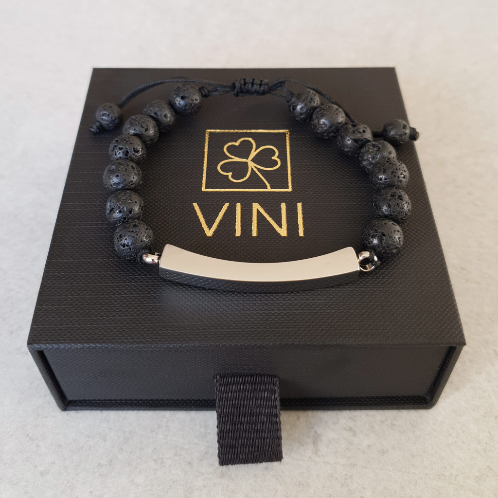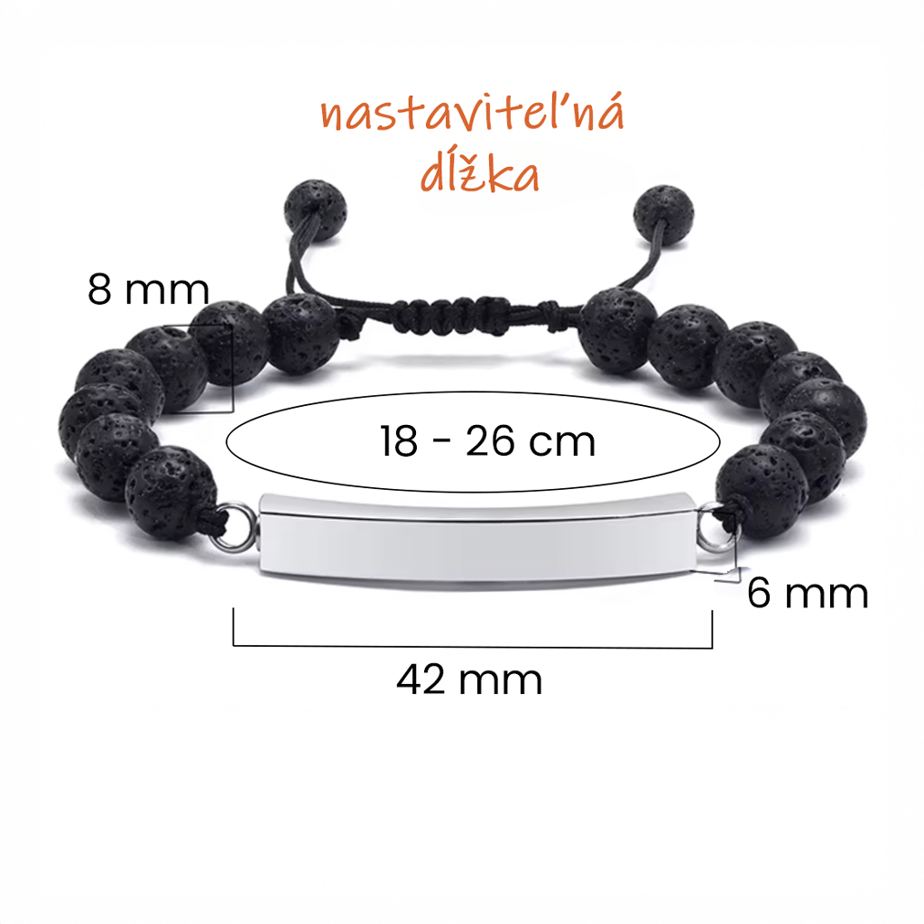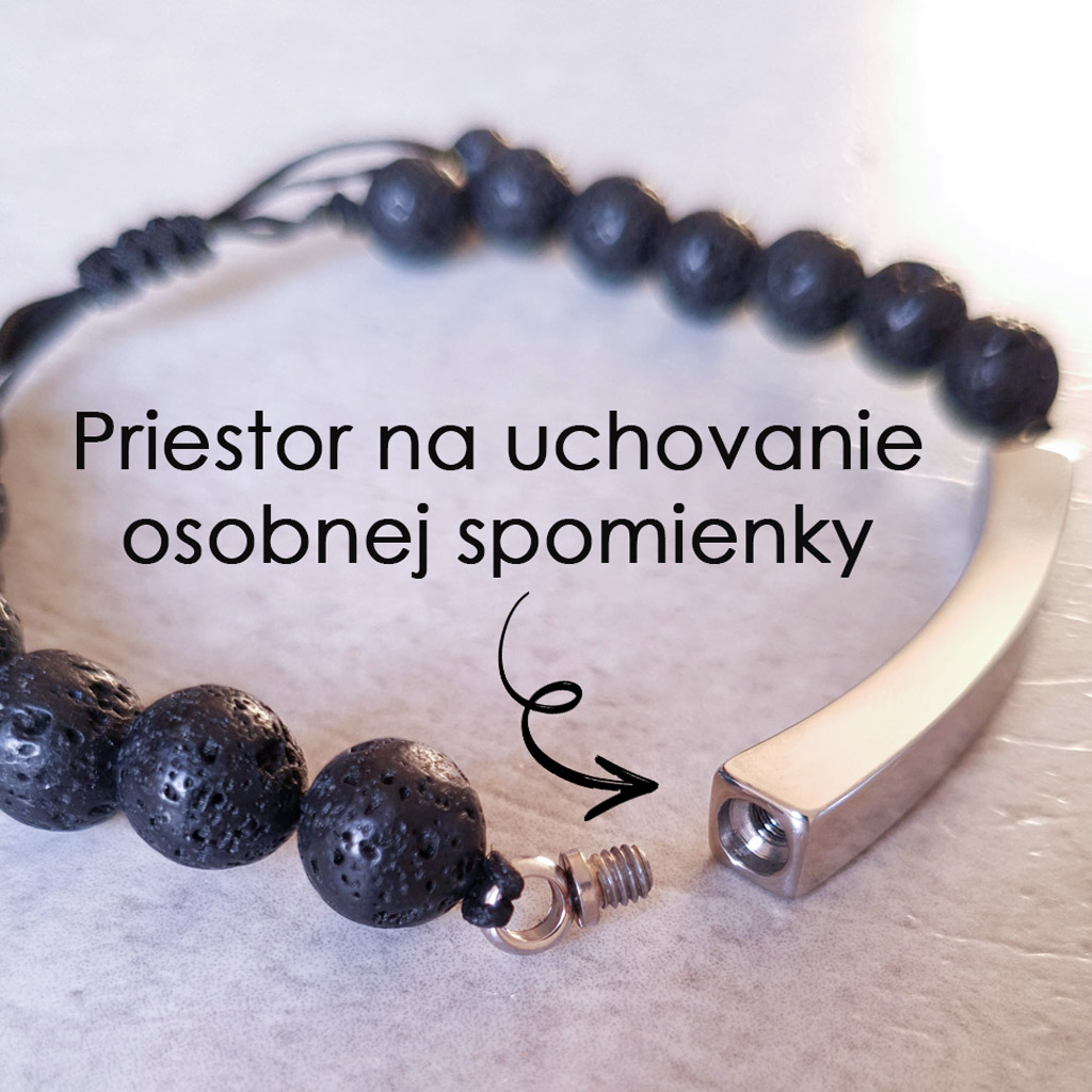 Elegantný pánsky personalizovaný náramok z prírodného lávového kameňa doplnený o diskrétny prvok z chirurgickej ocele, ktorý v sebe ukrýva priestor na uchovanie osobnej spomienky. ♥