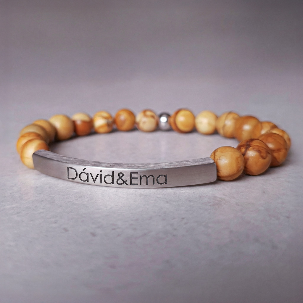 Elegantný pánsky personalizovaný náramok z prírodného minerálneho kameňa Jaspis Woodgrain doplnený o prvok z chirurgickej ocele s možnosťou gravírovania vlastného textu, mena, dátumu alebo symbolu. Ideálny darček s osobným významom.