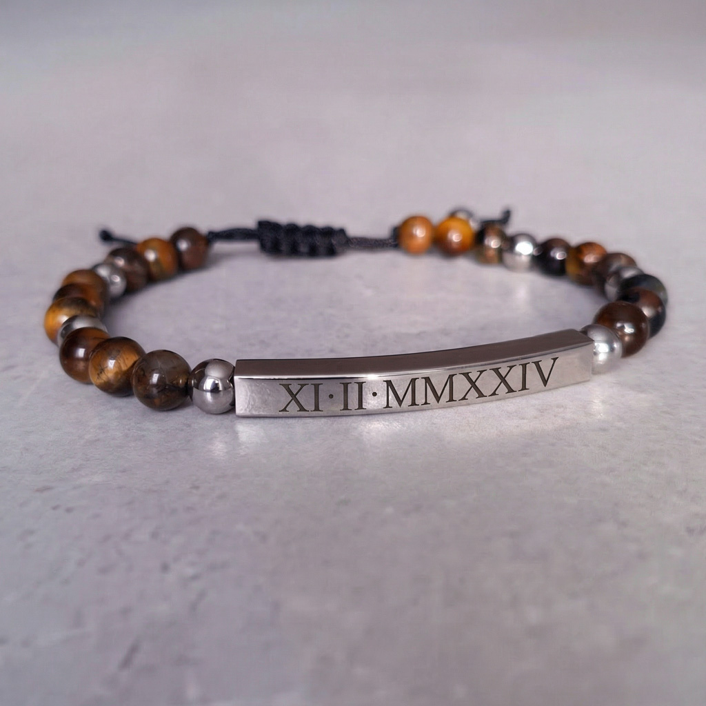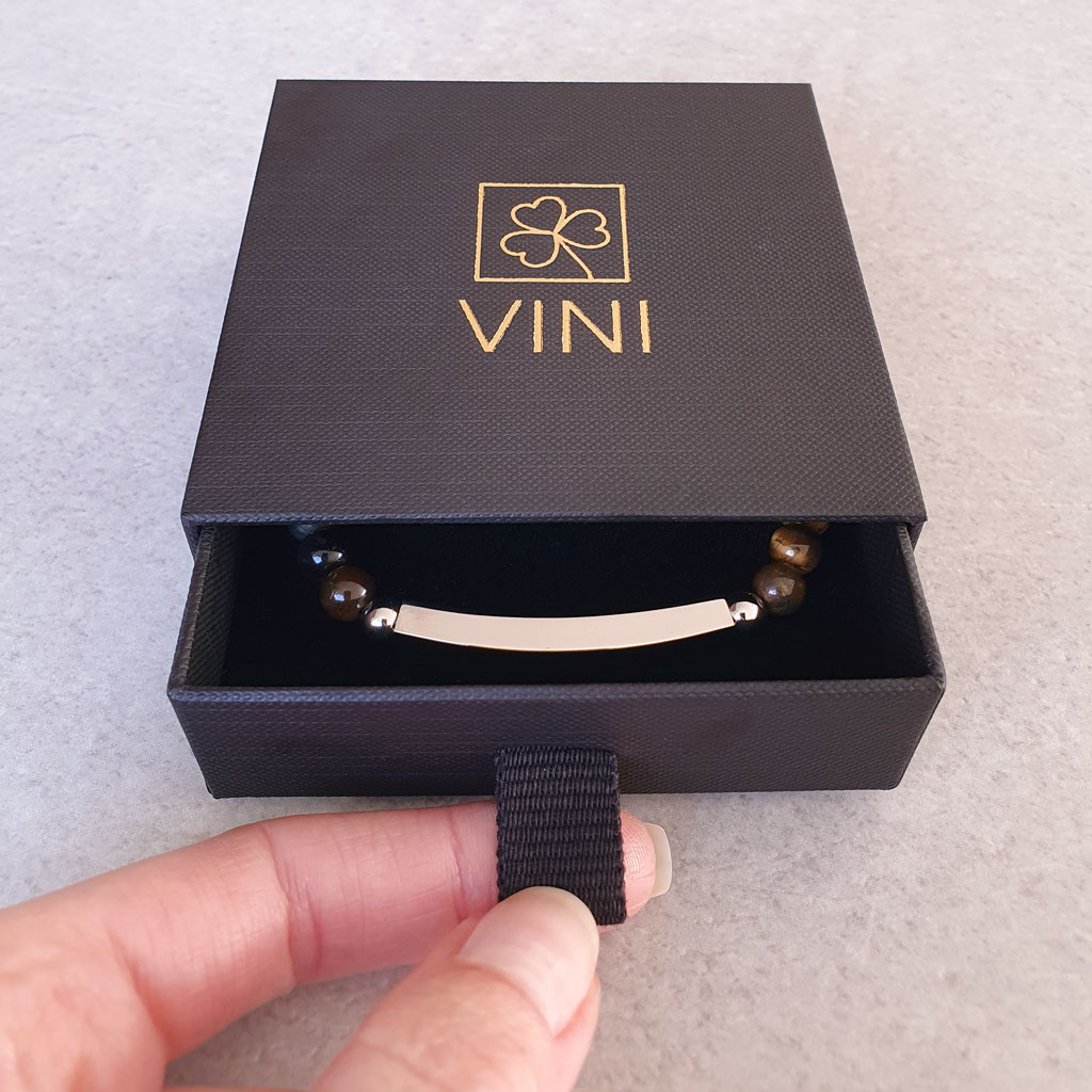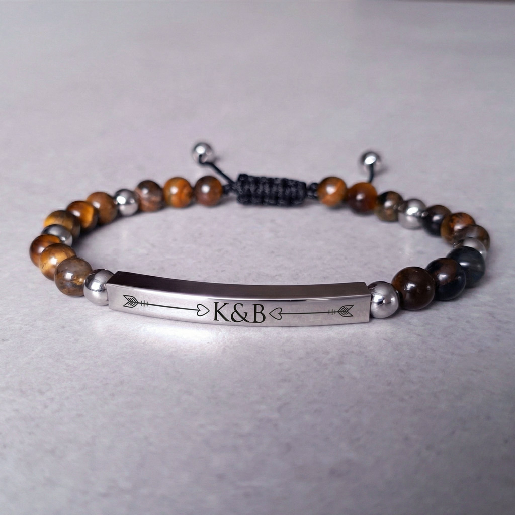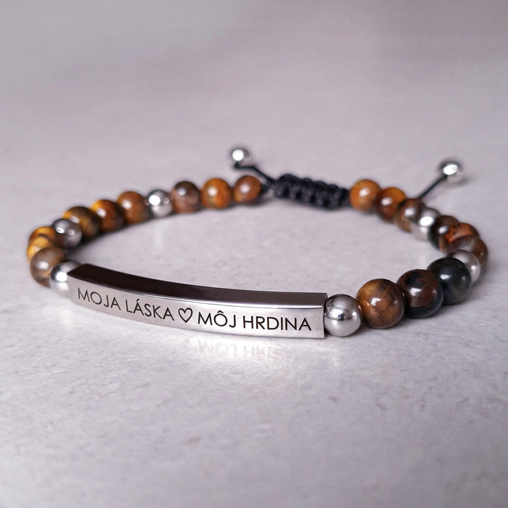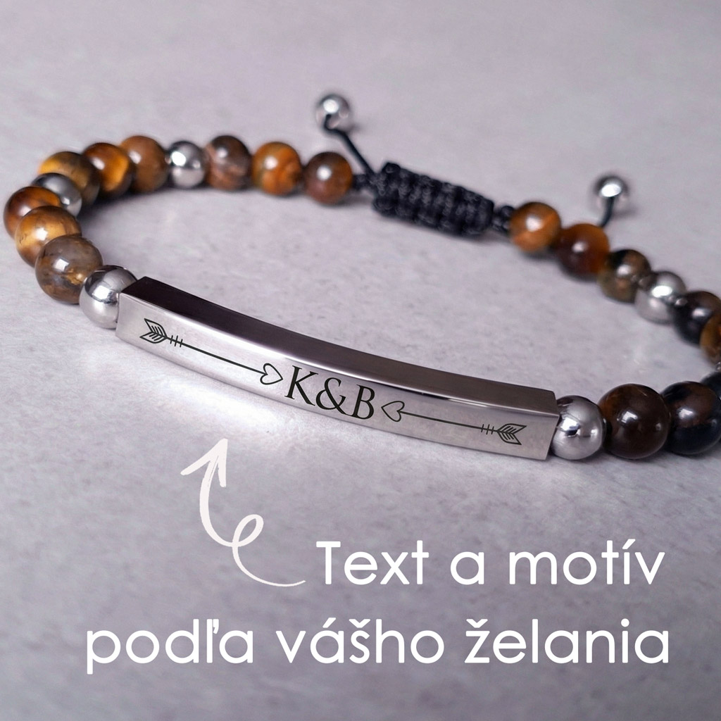 Pánsky personalizovaný náramok z prírodného minerálneho kameňa Tigrie oko doplnený o prvky z chirurgickej ocele s možnosťou gravírovania vlastného textu, mena, dátumu alebo symbolu. Ideálny darček s osobným významom.