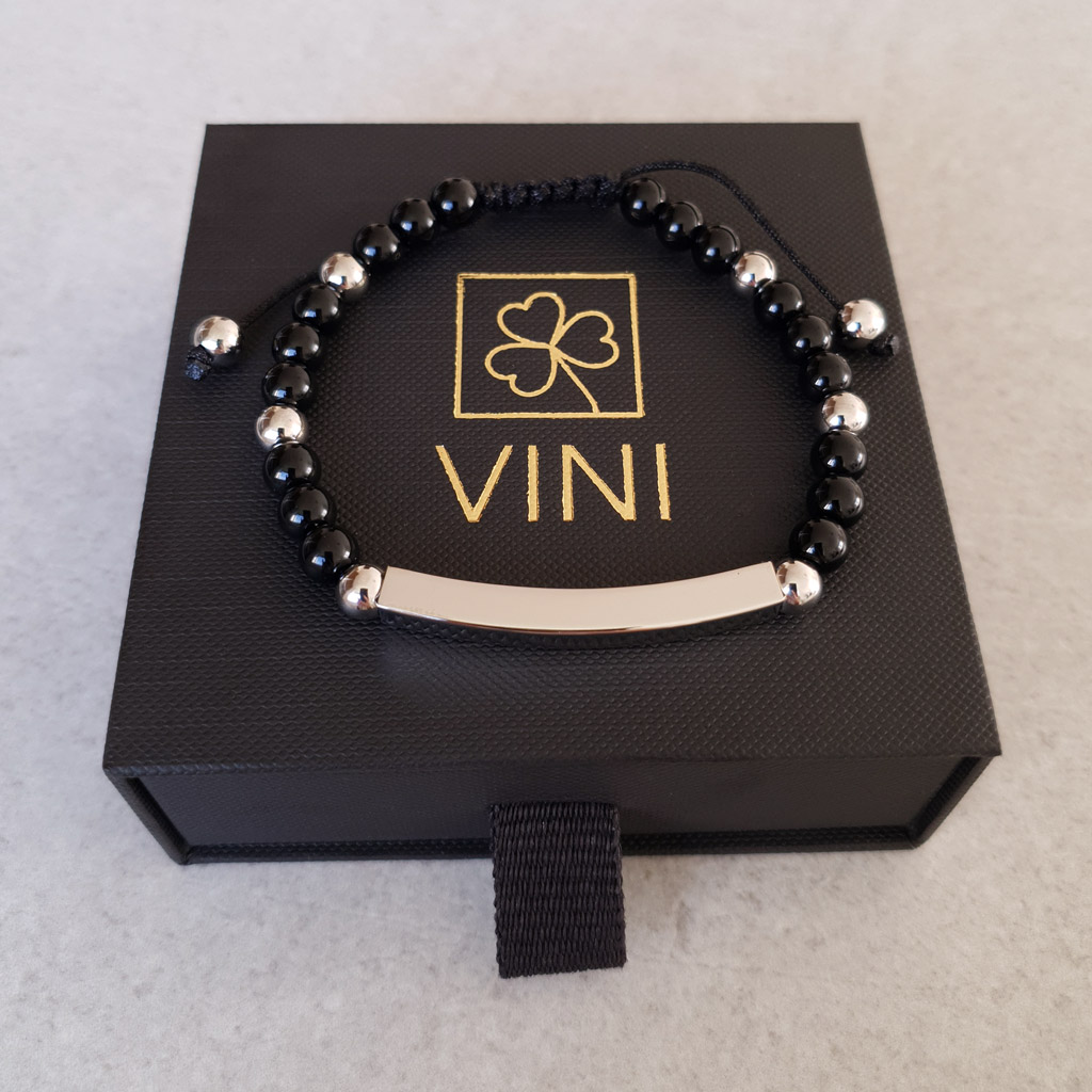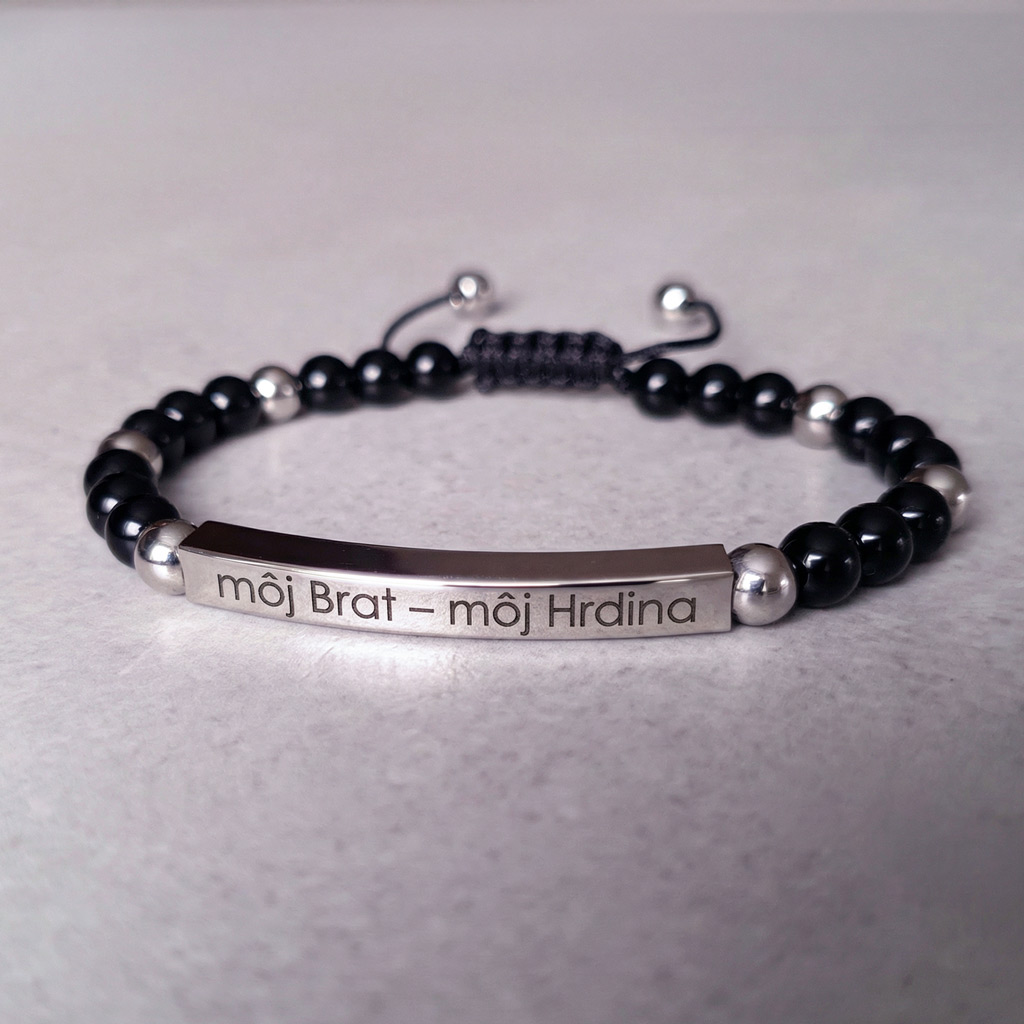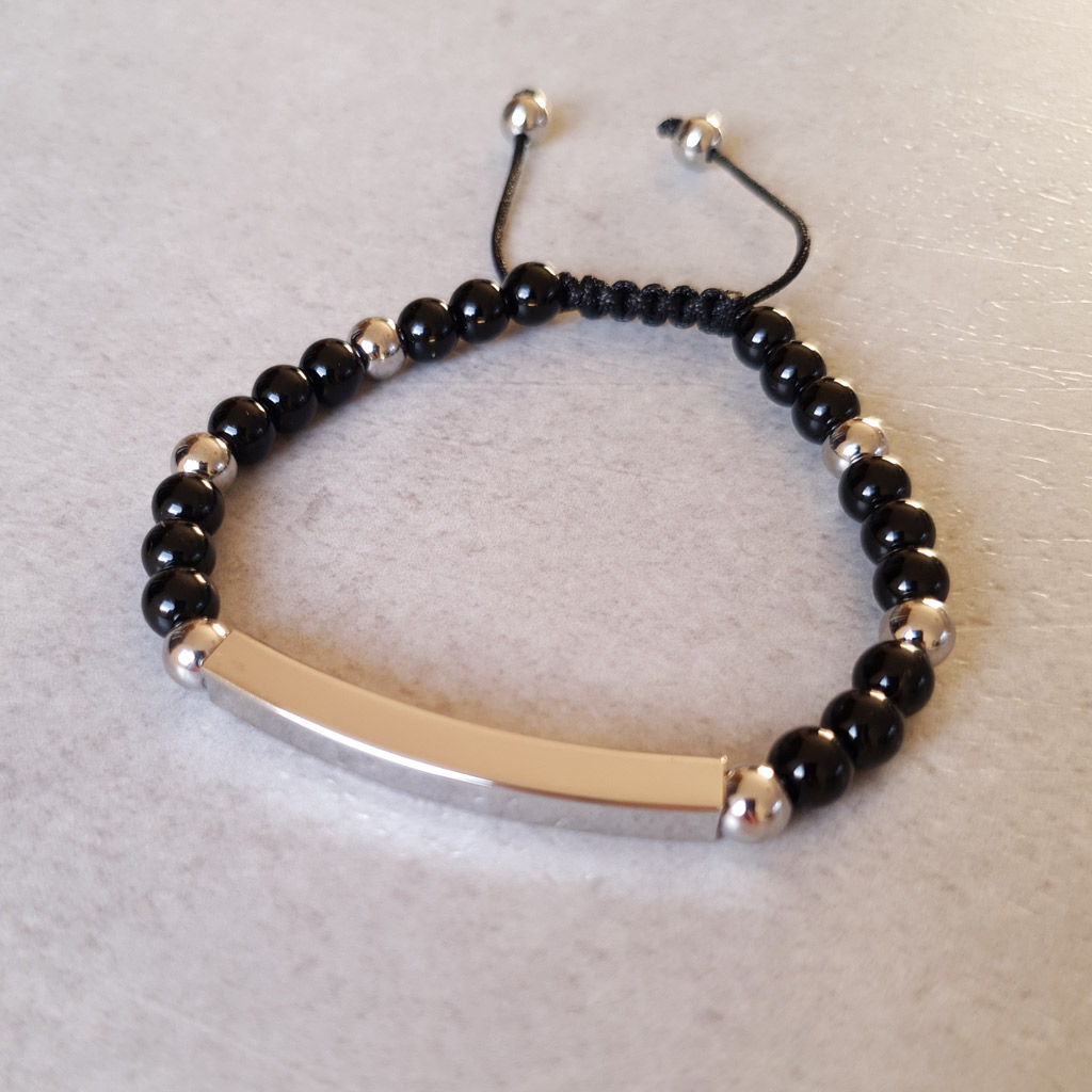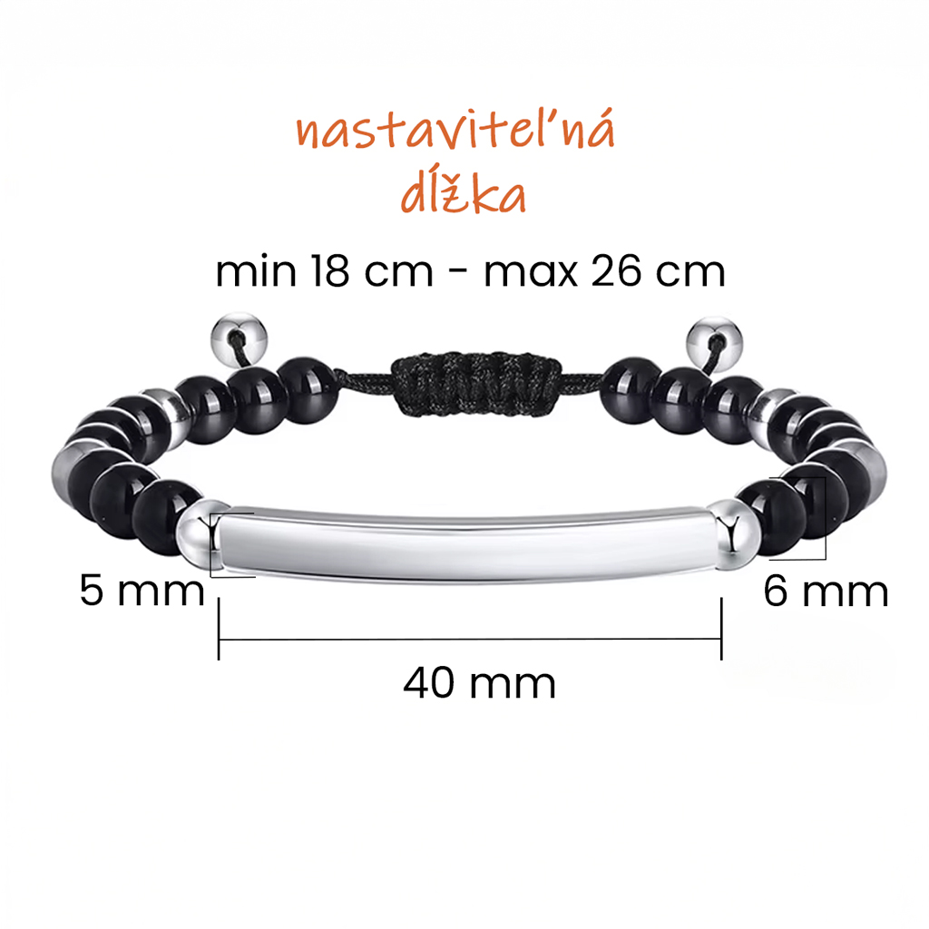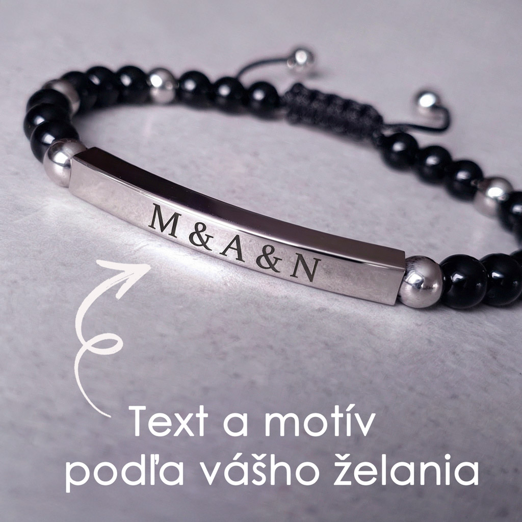 Pánsky personalizovaný náramok z prírodného minerálneho kameňa Ónyx doplnený o prvky z chirurgickej ocele s možnosťou gravírovania vlastného textu, mena, dátumu alebo symbolu. Ideálny darček s osobným významom.