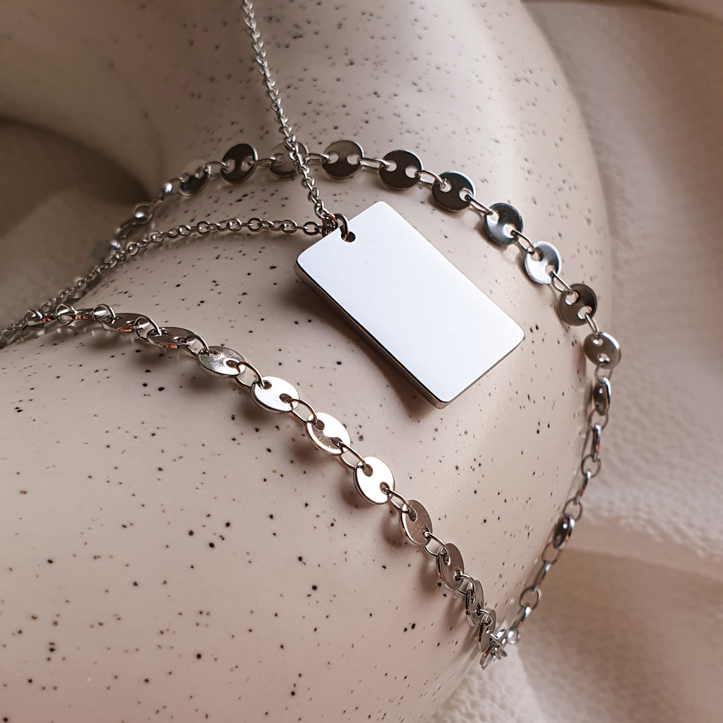 Set ADORE je elegantný vrstvený set náhrdelníkov z chirurgickej ocele s personalizovaným príveskom s gravírovaním, na ktorý si môžete pridať meno, dátum, iniciály alebo krátky odkaz s osobným významom.